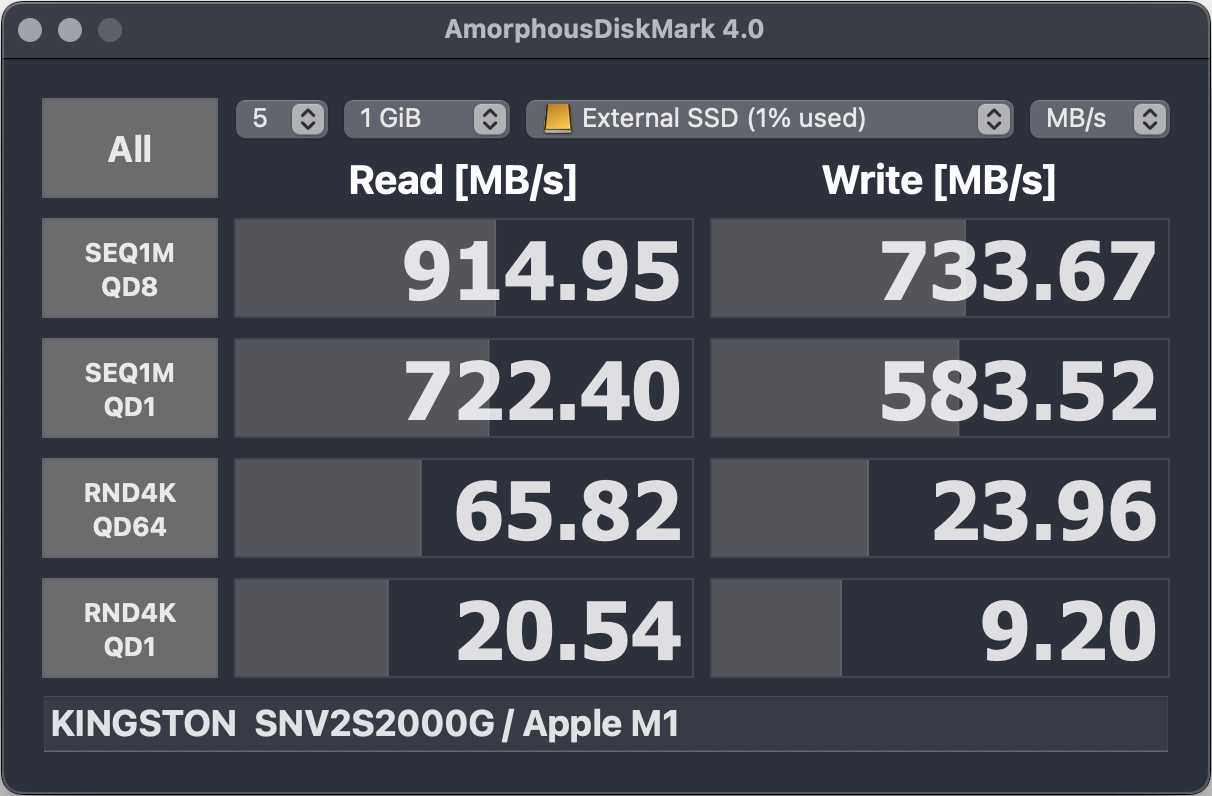 Ich weiß, dass mit dem Case die Geschwindigkeit auf etwa 1000 MB/s gedrosselt wird, das würde mir aber reichen. Nun habe ich einen Benchmark durchlaufen lassen und bin trotzdem recht enttäuscht von der Performance.