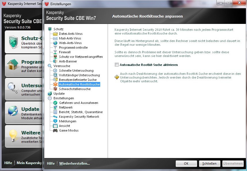 Nett aber unnötig ist auch die Möglichkeit, den Rootkit-Scan abschalten zu können, der viele bei KIS 2010 genervt hat. Ähnlich verhält es sich mit dem "Geo-Filter", mit dem man automatisch (aber nicht immer zuverlässig) Verbindungen zu Webseiten mit bestimmten Domains (z.B. .tr, .cn, .ru oder so) verbieten kann.