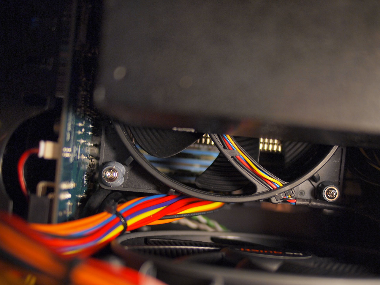 Als nächstes hab ich den Frontlüfter getauscht. Wie die Festplatte wird dieser nur "eingeklemmt" und kann somit sehr schön heraus genommen werden. Der installierte Frontlüfter hat eine Staubgitter davor, welches ich mit abgenommen hab und an den neuen Lüfter mit rangeschraubt hab. Diesen dann wieder in die Vorrichtung klemmen und gut ist. Den Lüfter hab ich "saugend" installiert. Er bläst die Luft nach vorne aus dem Gehäuse, bzw. zur Seite heraus weil dort die Lüftungsschlitze sind und idie Luft durch einen Schacht dorthin geleitet wird.