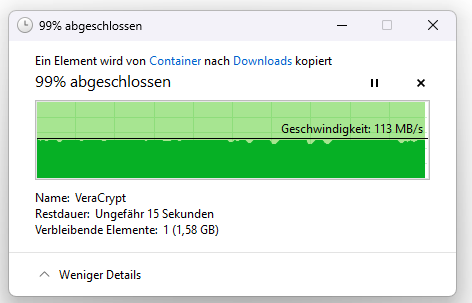 Habe eine Testübertragung einer 200 GB Datei von meinem NAS durchgeführt welche mit 113 MB/s übertragen wird. Soweit so gut, was mir aufgefallen ist sind die kleinen, kurzfristigen Absacker in der Dateiübertragung (siehe Screenshot).