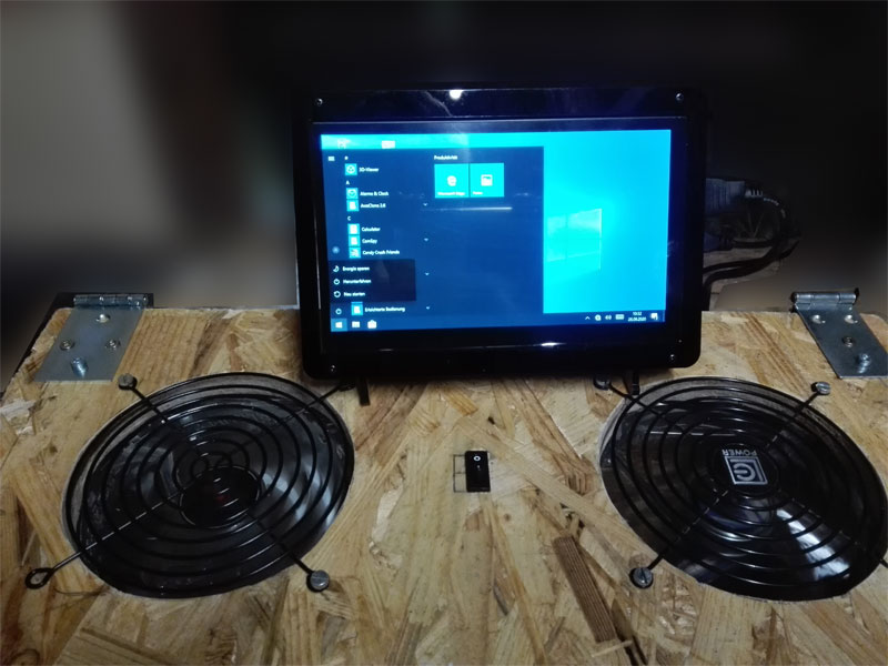Eine Lautsprecherbox mit Autoradio und Mainboard.