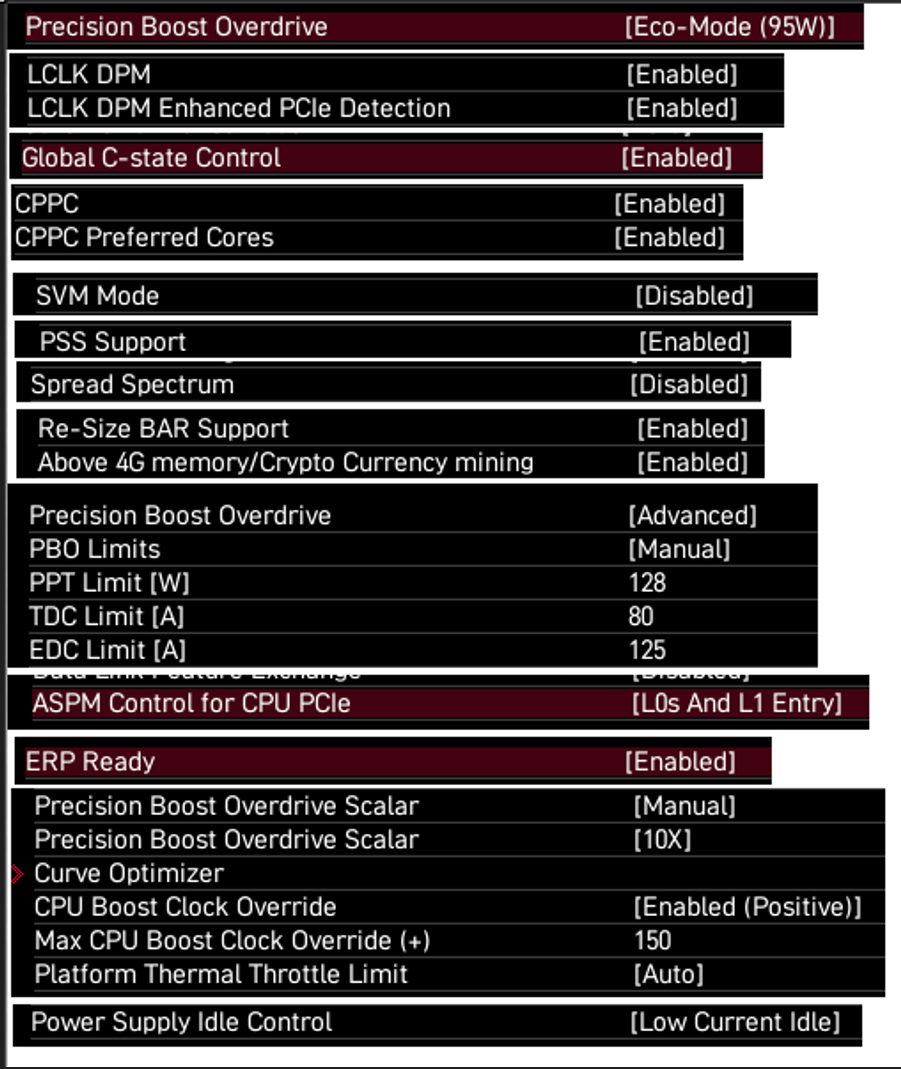 Im Bios habe ich diese Einstellungen vorgenommen, außer das mit dem 95W ECO Mode ist ja jetzt geändert.