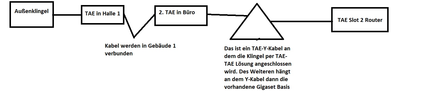 Der Problemfall Außenklingel: hierbei handelt es sich im Grunde um ein Telefon, dass nur klingeln kann, welches über eine TAE Dose die sich in der Halle 1 befindet mit der Eumex verbunden ist. Also es geht von der Eumex ein Kabel zu einer TAE Dose in die Halle 1 und von der TAE Dose geht ein 2-Draht zur Außenklingel. Ich weiß nicht so recht wie ich die Außenklingel nun an den Router bekomme. Direkt auf die 1. TAE kann ich ja nicht gehen auf Grund des IP Signals. Da Bilder mehr als Worte sagen habe ich hierzu auch eine Verkabelungsskizze angefertigt, so wie ich mir das am einfachsten vorstelle. Ist das aus technischer Sicht möglich? Mit dem TAE-TAE Kabel meine ich, dass die Klingel auf der 2. TAE im Büro auf den Klemmen 3 & 4 ankommt und von dort aus geht ein selbst gebasteltes Kabel bestehend aus einem normalen TAE-RJ11 mit F Stecker auf den TAE Y Adapter.