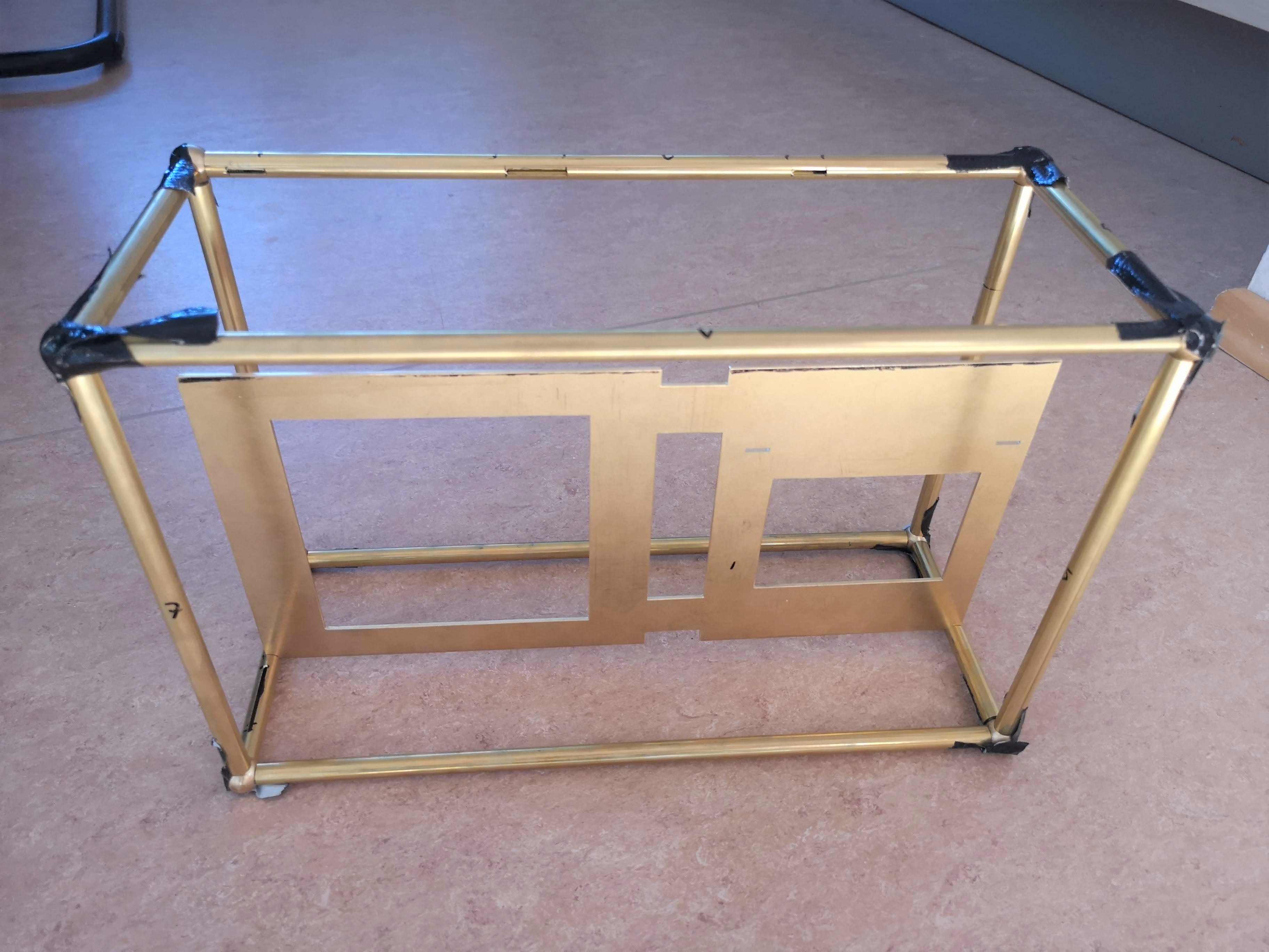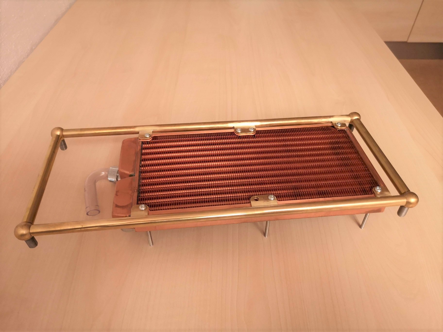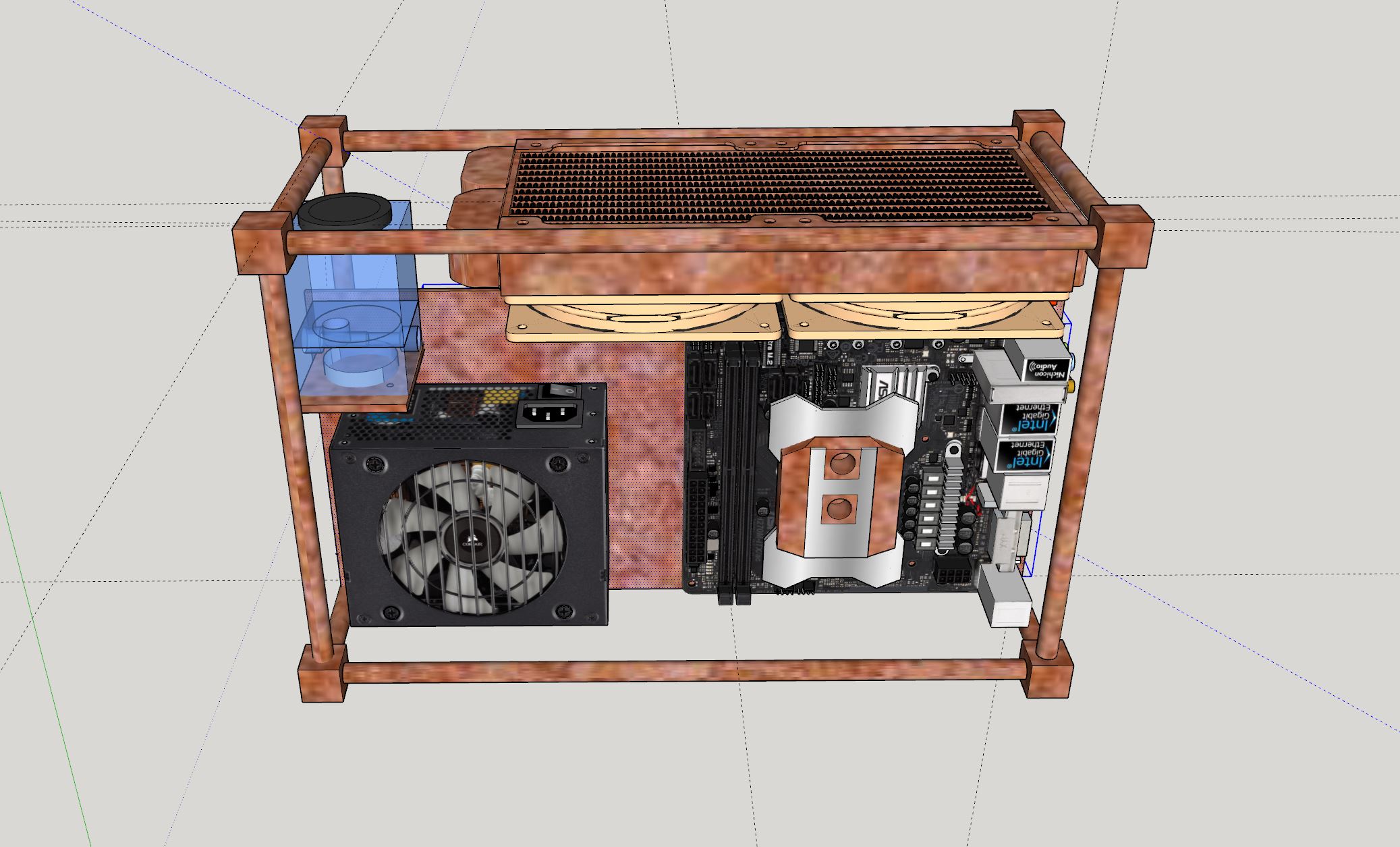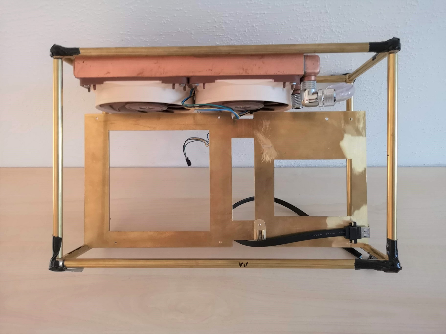Da meine MSI 2070 S nicht genug Platz im DAN A4 hat, fange ich nun mit meinem langjährigen Plan an, ein Gehäuse für ein ITX-Board selbst zu bauen. Es gibt bei im Internet jede Menge Gehäuse die ähnlich dem A4 sind und diese Möglichkeit out-of-the-box liefern. Einen interessanten Thread dazu gibt es hier https://smallformfactor.net/forum/threads/whats-on-taobao.885/page-87 . Auf der Suche nach einem eigenen Konzept für ein kleines Gehäuse bin ich beim Material Messing hängengeblieben. Nach längerem Probieren in Sketchup habe ich nun folgendes Konzept:
