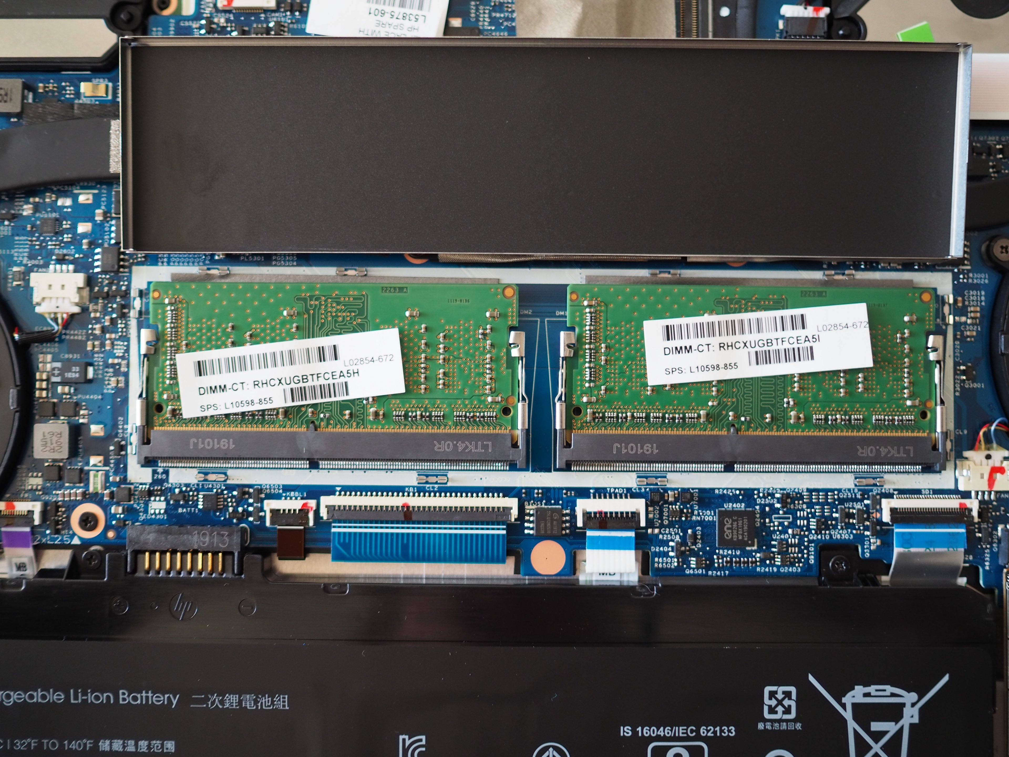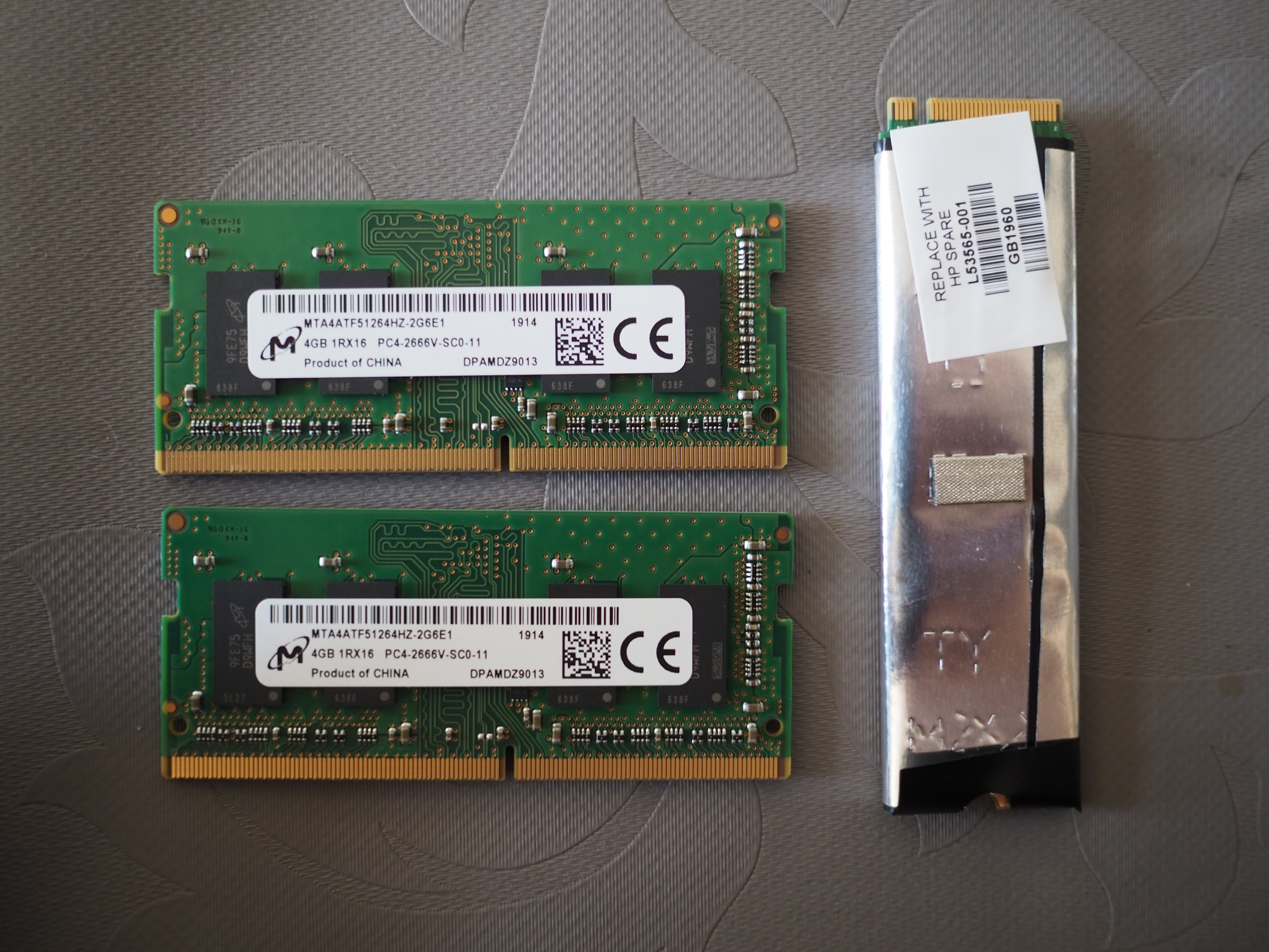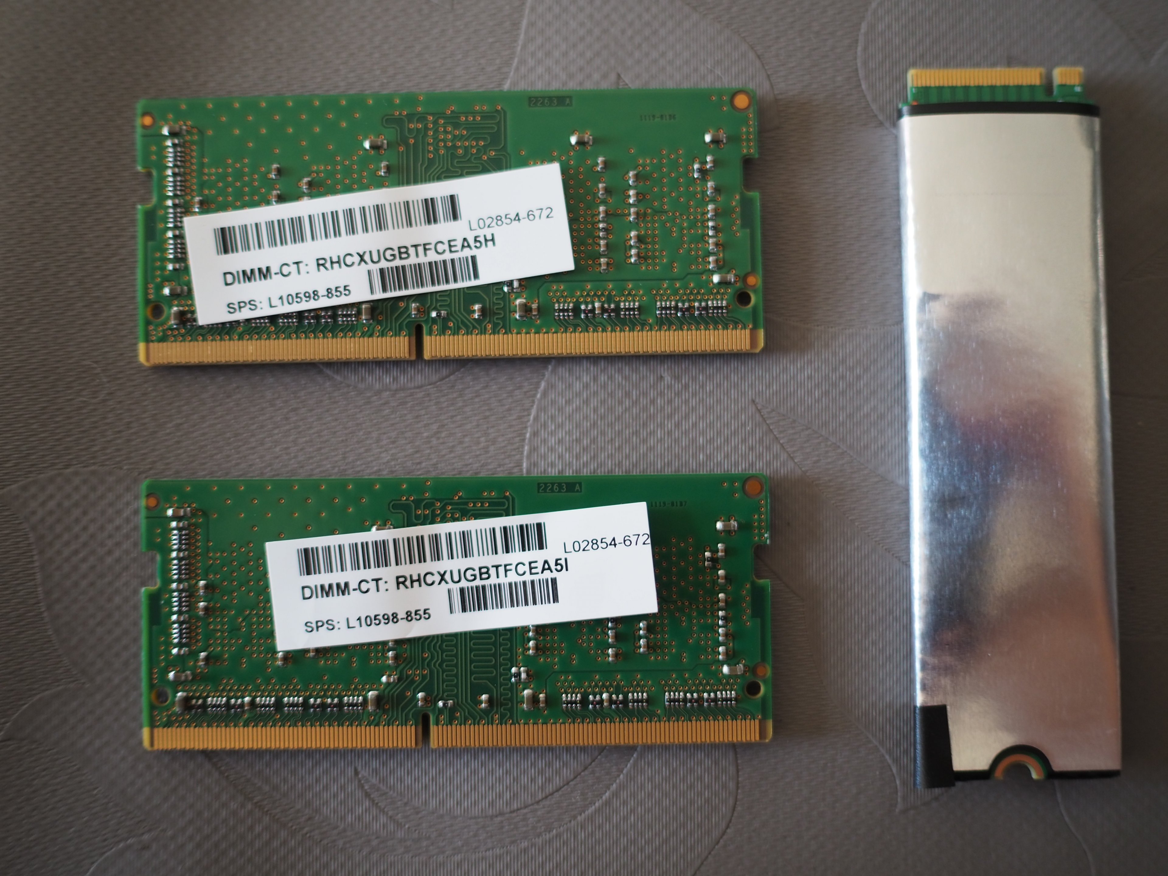 Liegt das Innenleben erst einmal frei kann der RAM einfach getauscht werden. Dazu muss allerdings erst die Metallabdeckung entfernt und anschließend die Klammern welche die einzelnen Module festhalten, gelöst werden. Glücklicherweise kommen von Anfang an 2x Module für Dual Chanel zum Einsatz. In meinem Fall waren es 2x 4GB DDR4 SODIMM 2666 mit CL19. Was mich etwas erstaunt hat, schließlich werden offiziell von der CPU (APU) Ja nur 2400er unterstützt. Wurde aber ohnehin vor Inbetriebnahme gegen 2x 8GB DDR4 SODIMM 2400 CL14 getauscht, welcher auch anstandslos erkannt wurde.