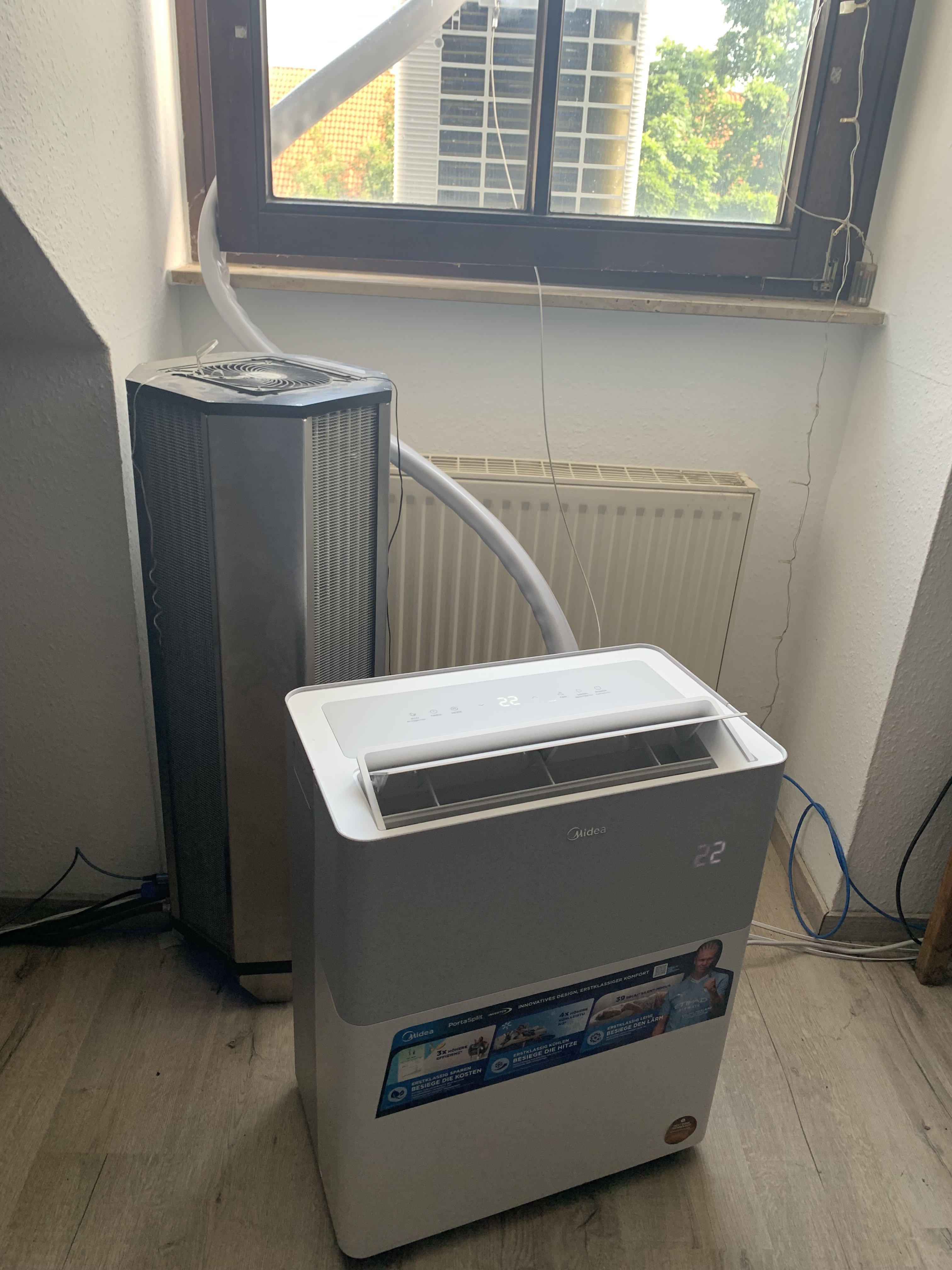 Ach ja, Probleme mit dem Kondenswasser habe ich glücklicherweise nicht. Alles landet in der Außeneinheit und dort in einen kleinem Eimer. Die Außeneinheit steht auf einem kleinen Podest auf dem Balkon. Im Sommer sozusagen als Festinstallation. Und wenns dann wieder kälter wird, wird sie weggeräumt.