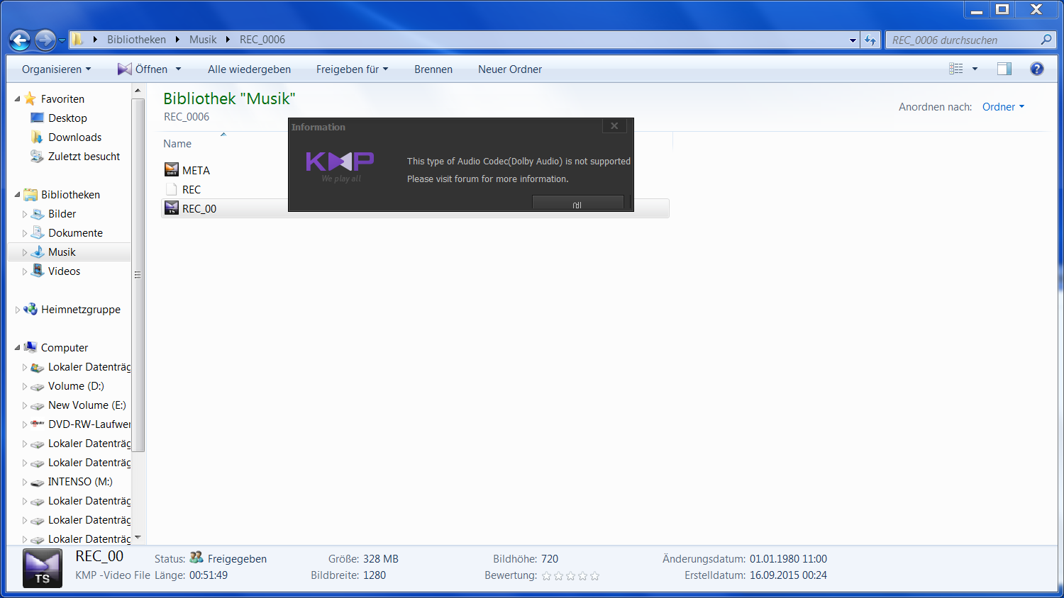 du bist dieser kleinen fehlermeldung nicht mächtig? da steht, dass der player diese datei nicht abspielen kann. scheinbar scheint er ein problem mit "dolby audio" zu haben