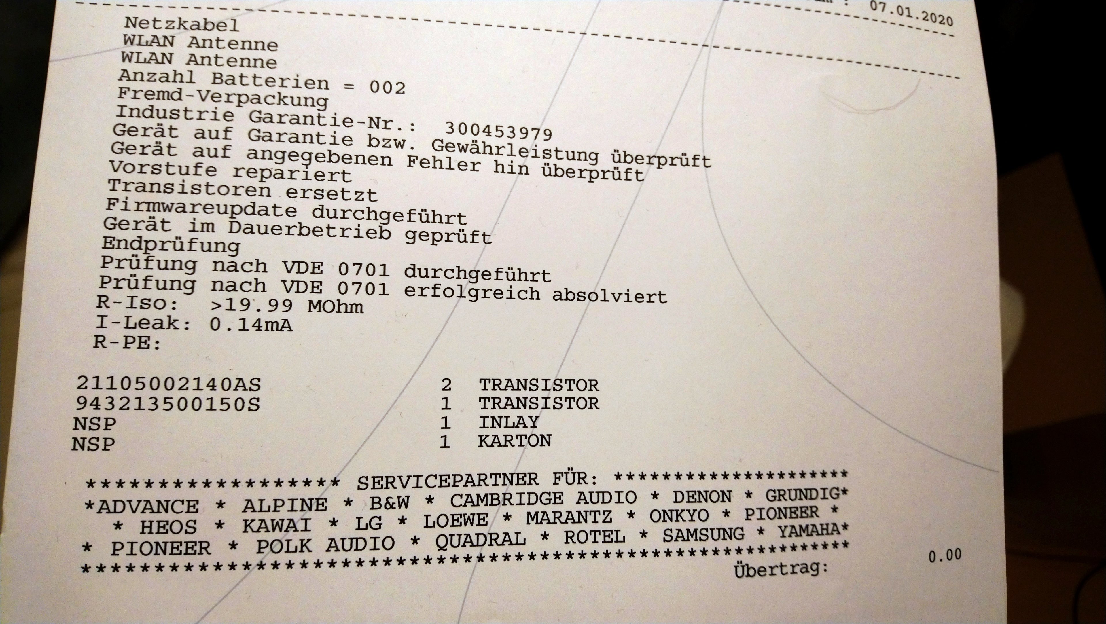 Nachdem das alles nichts geholfen hat, habe ich den AVR (für den ich noch bis Februar Gewährleistung über Amazon habe) dort zur Reparatur eingeschickt (s. Foto). Hat aber auch nichts genützt, das Problem ist genau wie vorher vorhanden.