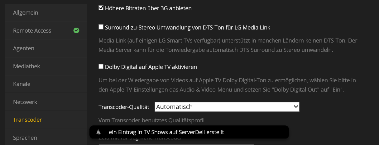 nein, da kannst du nichts einstellen. da gibts nur profile wie "hohe quali" und "hohe geschwindigkeit". aber nicht wie bei kodi, wo du sagen kannst: 4 Mbit bei 720P, weil ich nur 6 mbit maximal durch die dünne internetleitung raus bekomme. und "lass die transcoder-finger von material, was eh unter 4 mbit hat".