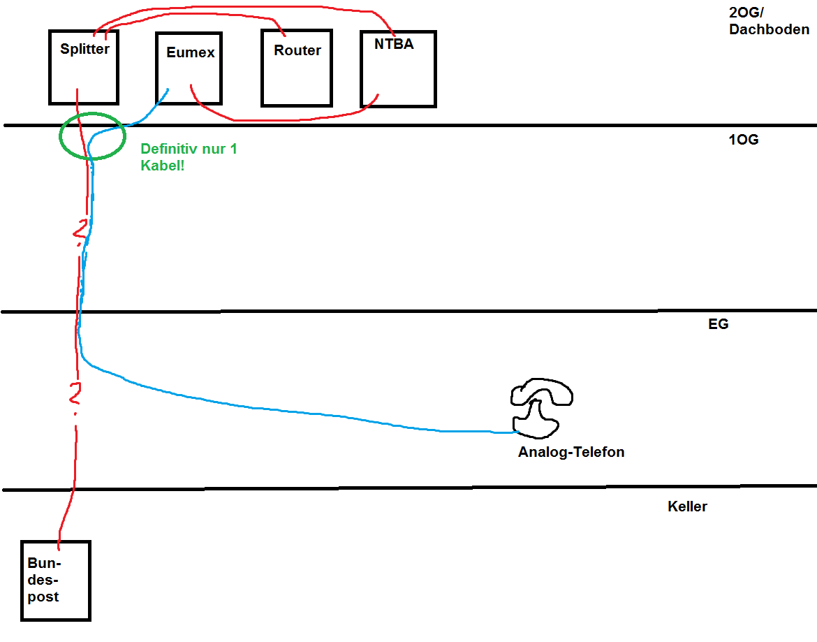 Naja die Leitung von der Telekom (also vom Kasten mit der Bundespost drauf) geht bis in den Dachboden, in den Dachboden geht aber nur ein einziges Kabel (weil der nachträglich ausgebaut wurde), dort ist dann Splitter + Router + Eumex. Von der Eumex geht dann auch wieder ein Kabel raus zu einem analogen Telefon im Erdgeschoss.