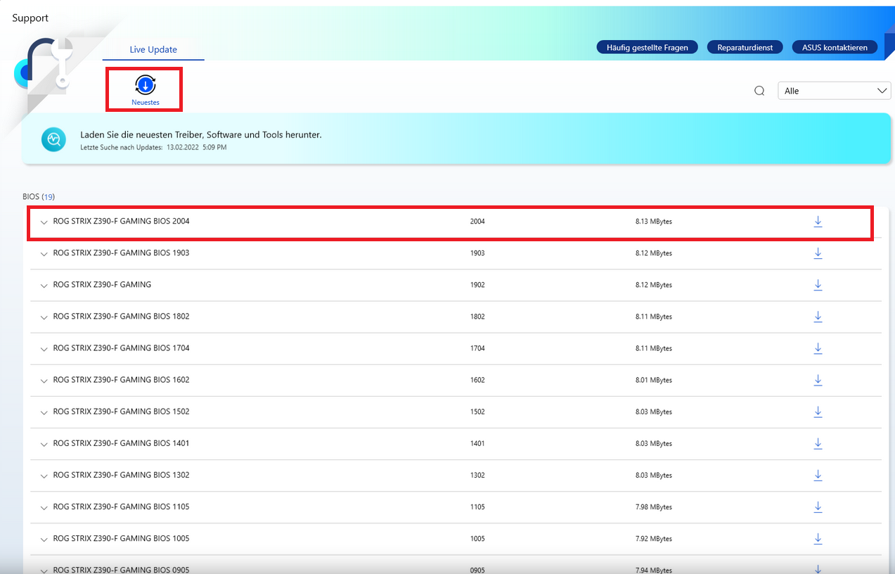 Da sagen sie in der Anleitung man muss im Programm im Reiter Support auf Neueste gehen diese Option gibt es aber bei mir nicht.