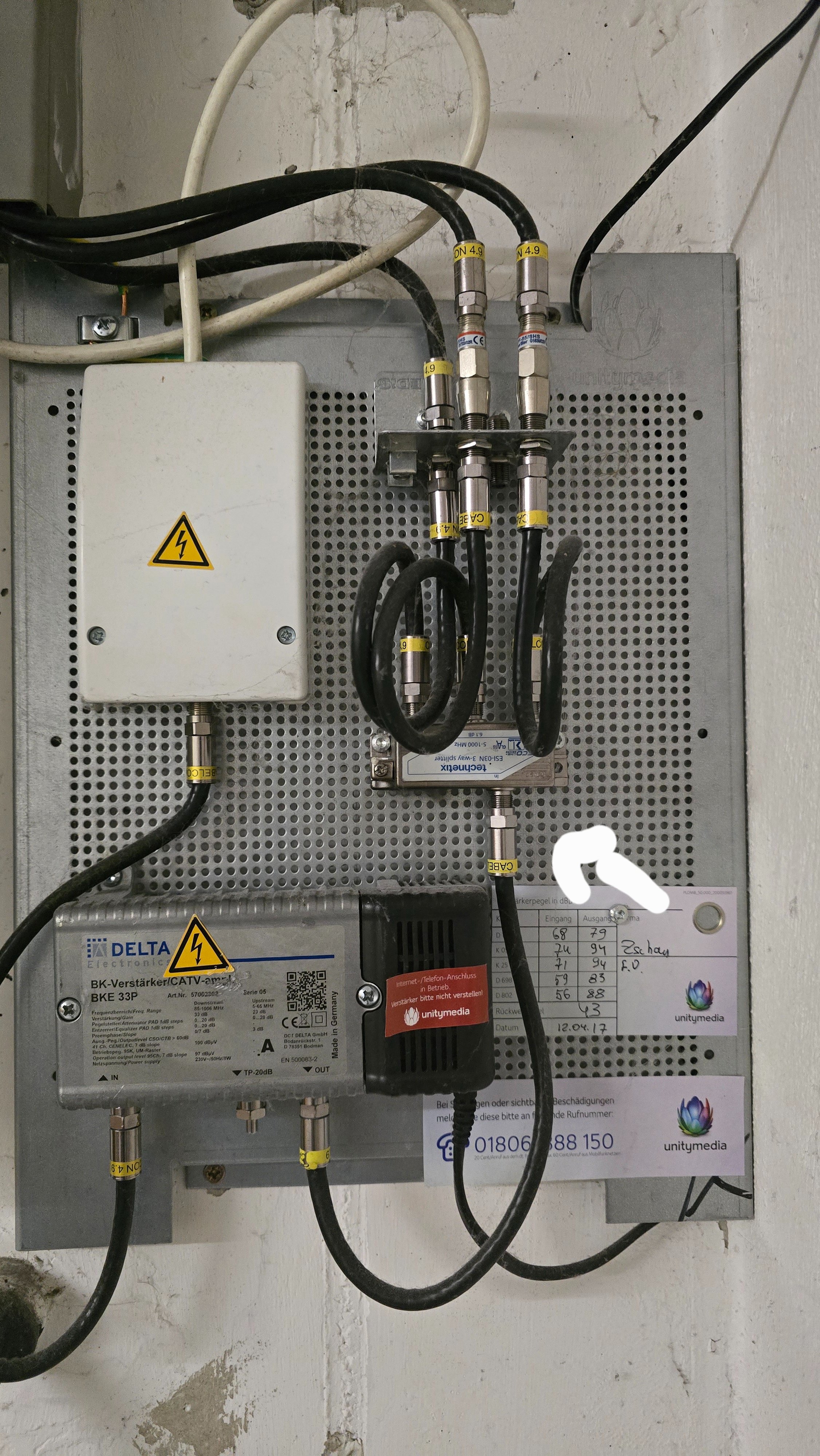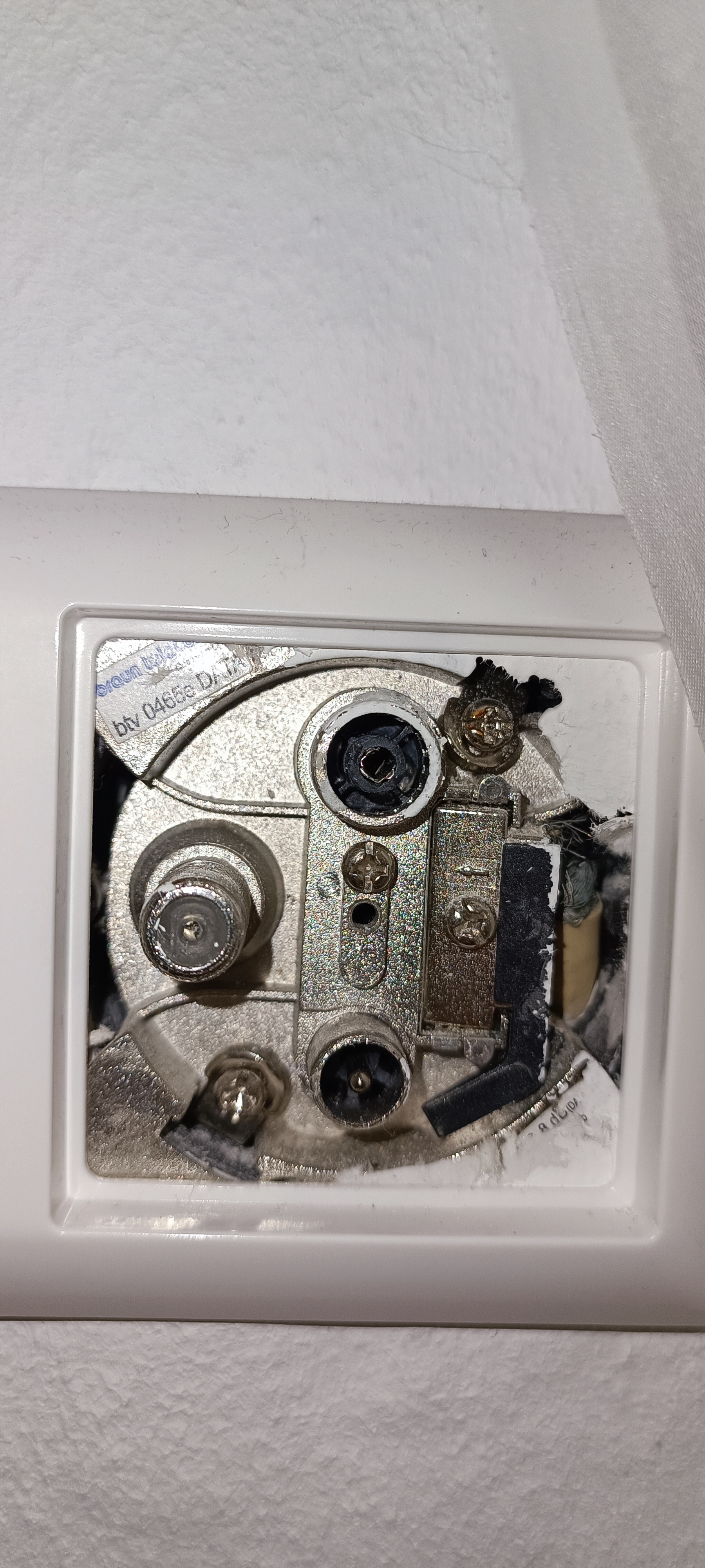 Der Techniker meinte damals wir sollen uns EINEN Platz aussuchen für den Router, und dort kann er alles anschließen. Er hat dann dort eine Dose mit 2x Data angeklemmt, (sorry für das unscharfe Bild) von da aus geht ein Coax Kabel zum Router.