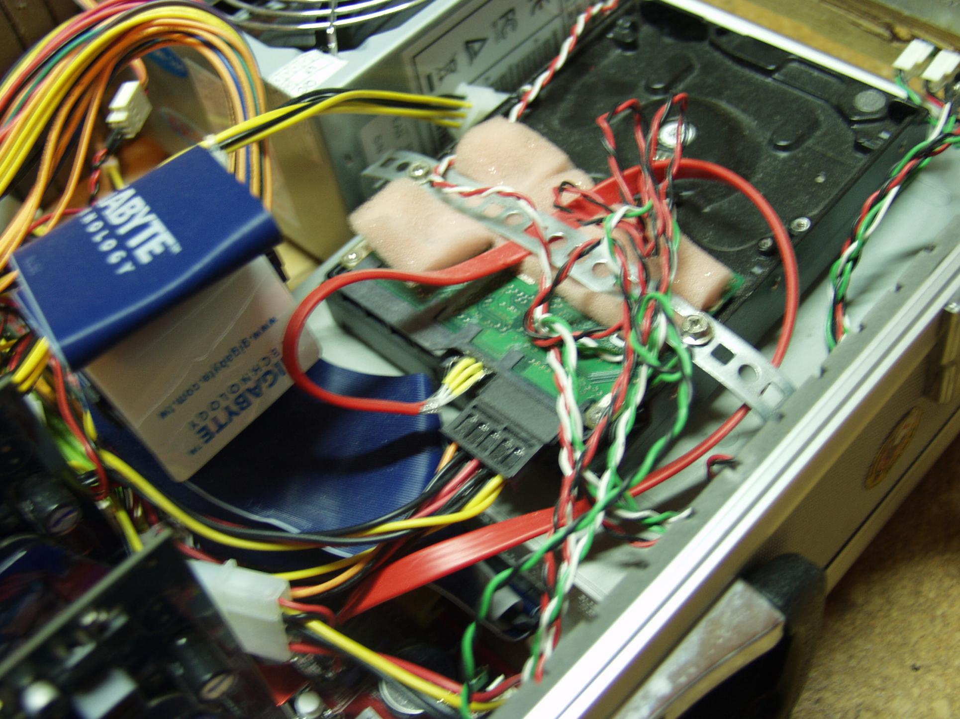 Das wohl auffälligste Manko ist die Festplatte. Diese ist vor unserem Einbau kaputt gegangen. Eher gesagt ist der HDD Controler am SATA Anschluss zerstört gewesen, weswegen wir ein besagtes Kabel einfach an die HDD angelötet haben. (sihe Bilder