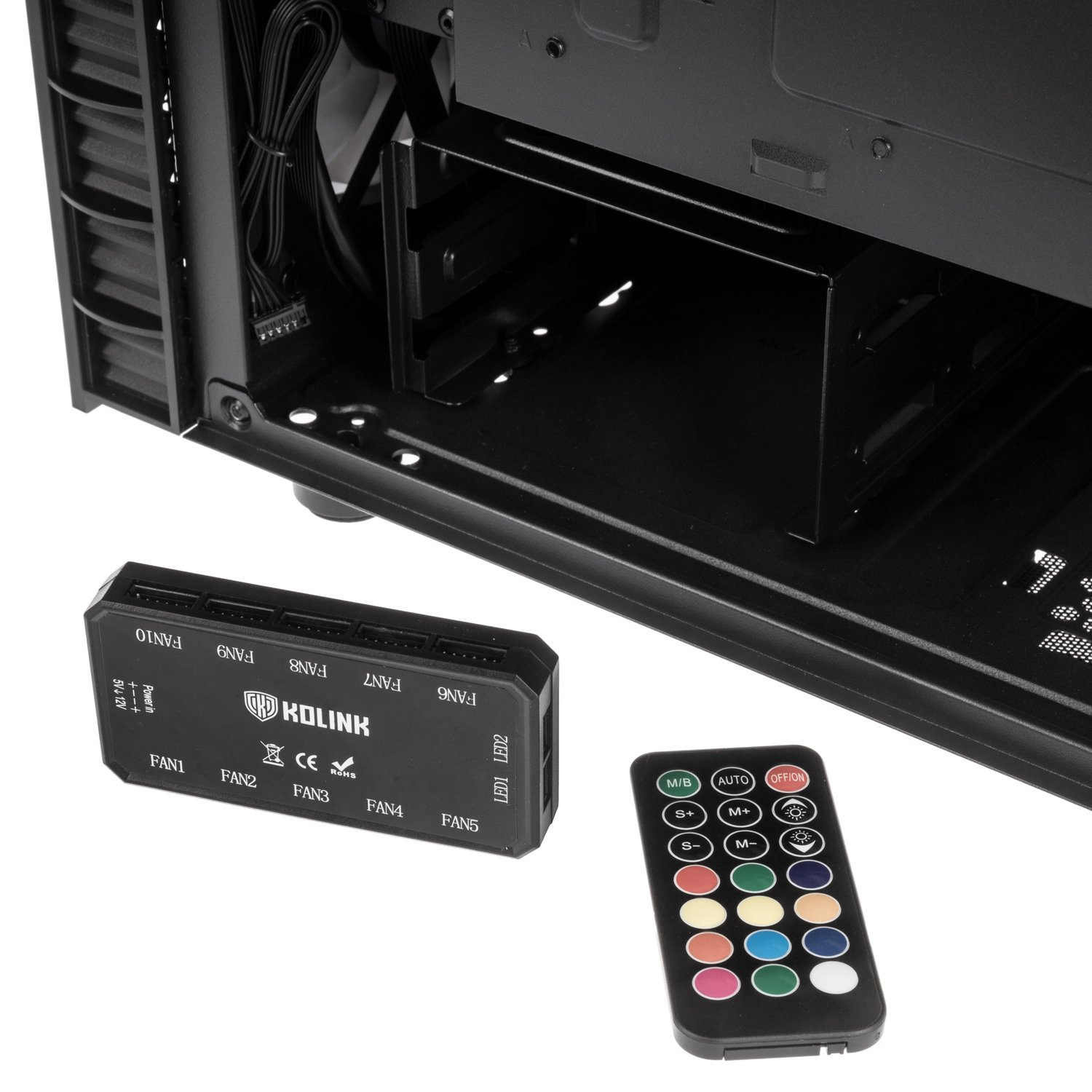 Was die Lüfter angeht, so verfügen die Lüfter lediglich über einen proprietären Anschluss. Es handelt sich nicht um PWM-steuerbare Lüfter, der RGB Anschluss ist ebenfalls nicht universal. Zur Steuerung der Beleuchtung ist zwingend der Kolink Controller erforderlich. Die Steuerung der Beleuchtung kann dann über eine Fernbedienung erfolgen oder mittels Synchronisation mit der jeweiligen Mainboard Software. Zu diesem Zweck verfügt der Controller über einen 3-Pin ARGB Anschluss zum Mainboard.