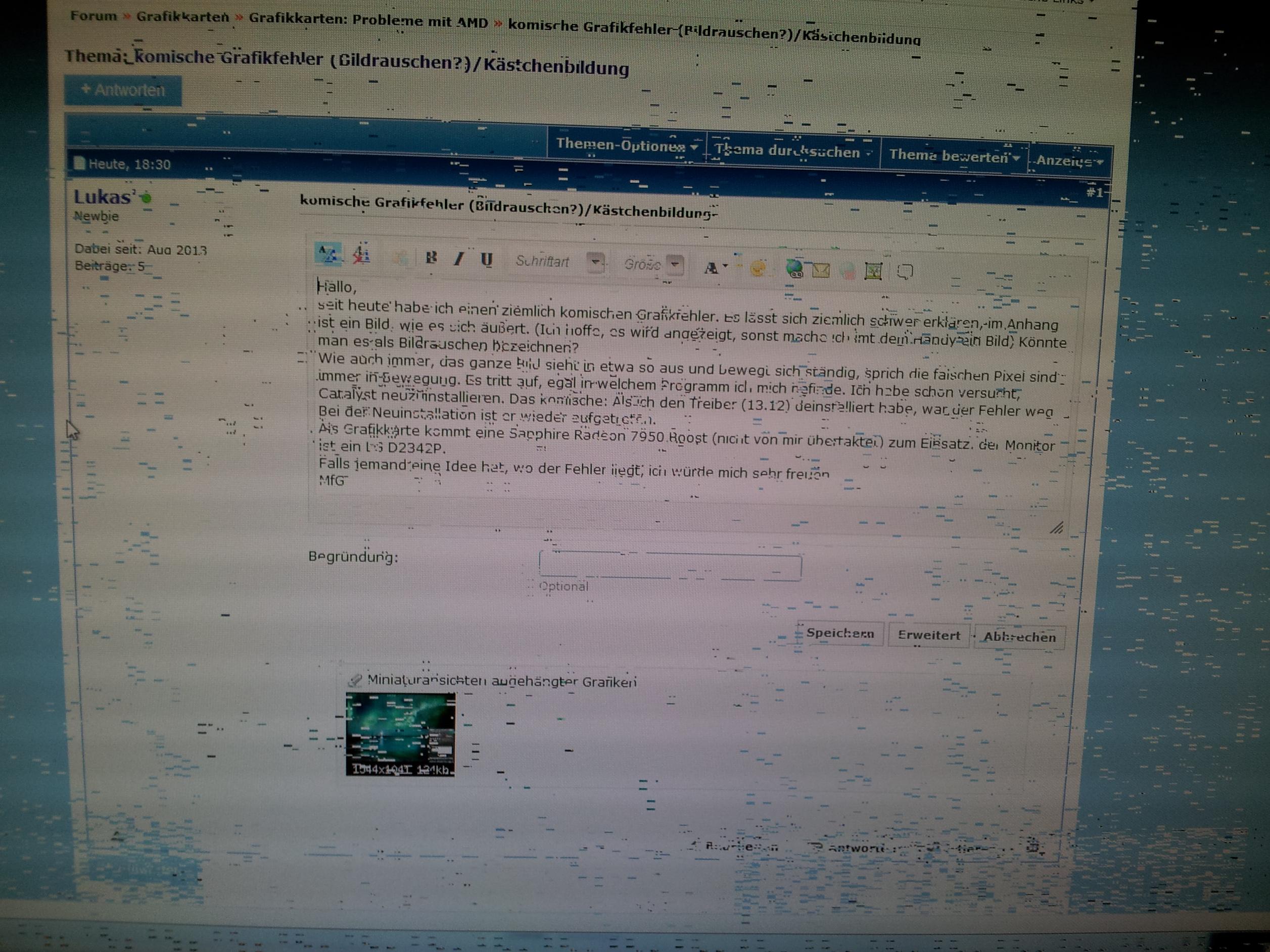 Wie auch immer, das ganze Bild sieht in etwa so aus und bewegt sich ständig, sprich die falschen Pixel sind immer in Bewegung. Es tritt auf, egal in welchem Programm ich mich befinde. Ich habe schon versucht, Catalyst neuzuinstallieren. Das komische: Als ich den Treiber (13.12) deinstalliert habe, war der Fehler weg. Bei der Neuinstallation ist er wieder aufgetreten.