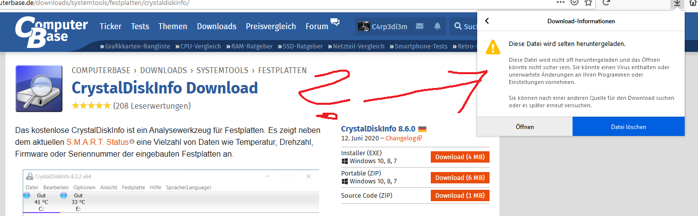 Komisch nur, dass die ausgerechnet bei Crytals Disk kommt. Ich habe mal eben ein paar Testdownloads anderer Programme auf CB durchgeführt und da kam die Meldung nicht.