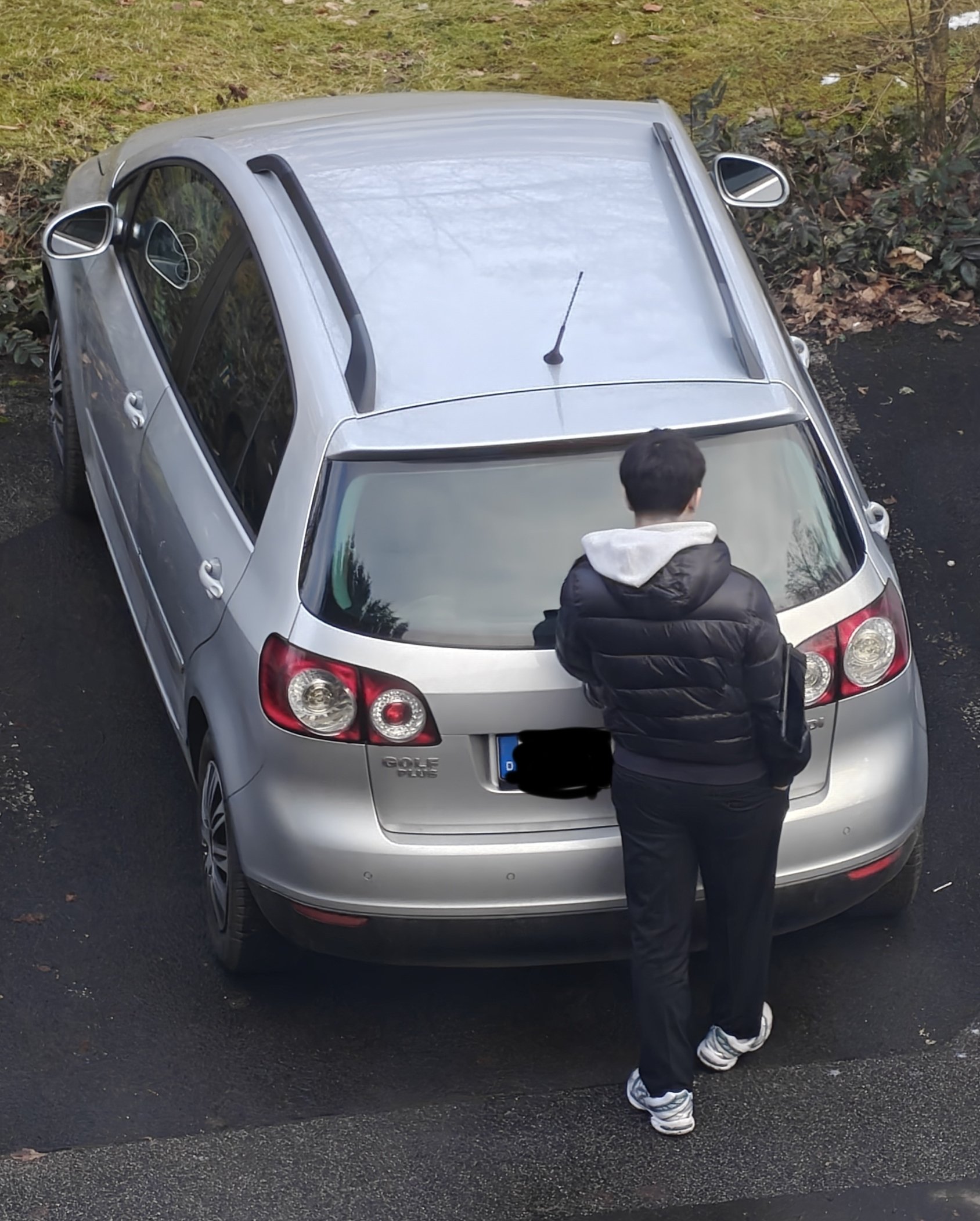 Ich habe heute ein Foto von einem jungen Mann gemacht, der sich an meinem geparkten Auto auffällig verhalten hat. Er hat sein Mobiltelefon direkt an das Kofferraum-/Heckfenster gehalten und hatte zusätzlich ein Tablet am Arm (wie auf einer Halterung). Er wirkte, als würde er etwas scannen oder prüfen. Hat jemand eine Idee, wofür man das macht oder ob das eine bekannte Masche ist?
