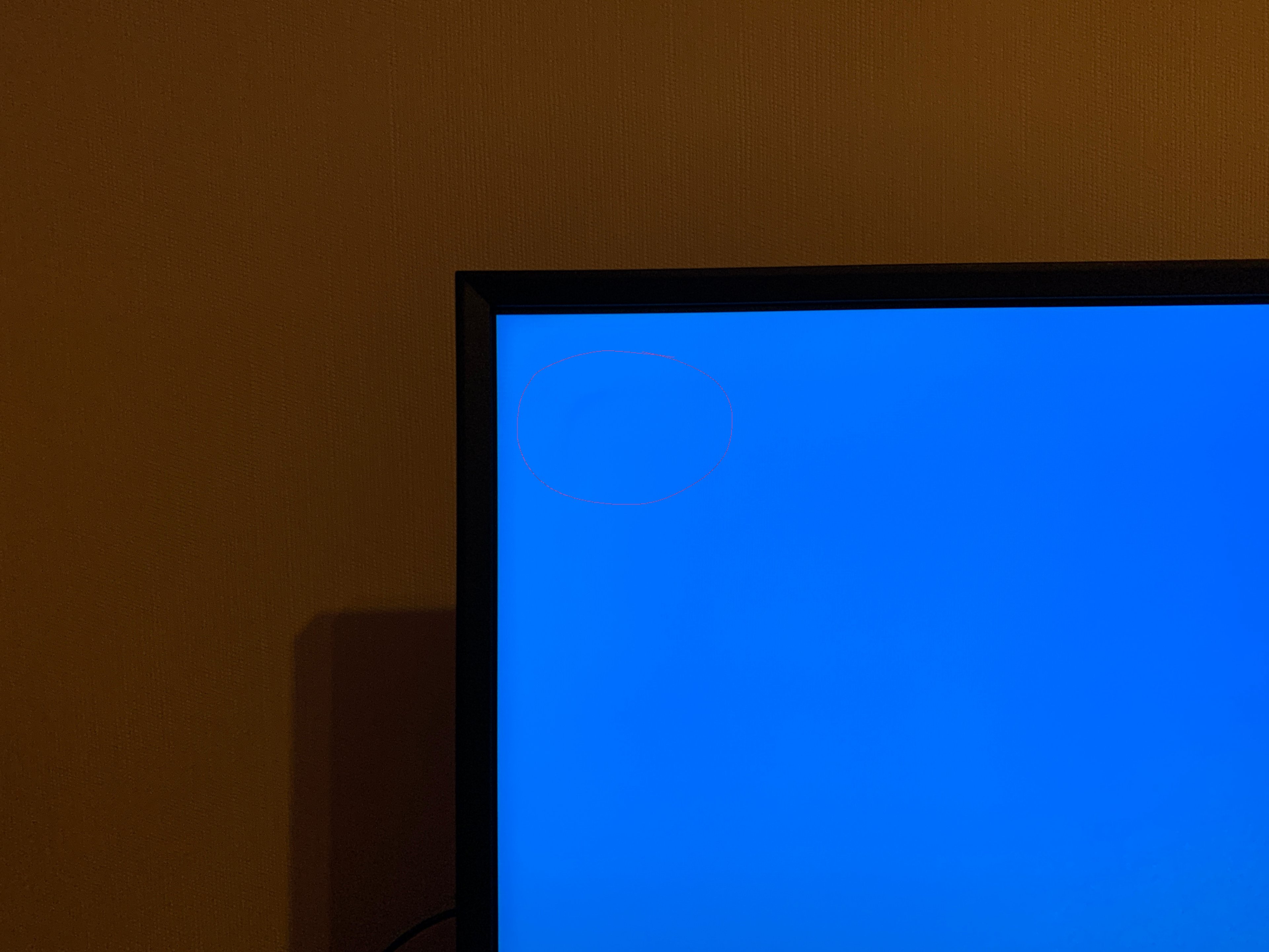 Wenn ich den Monitor ausschalte und mir mit einer starken Taschenlampe die Obergläche anschaue, kann ich keine Beschädigungen jeglicher Art feststellen.