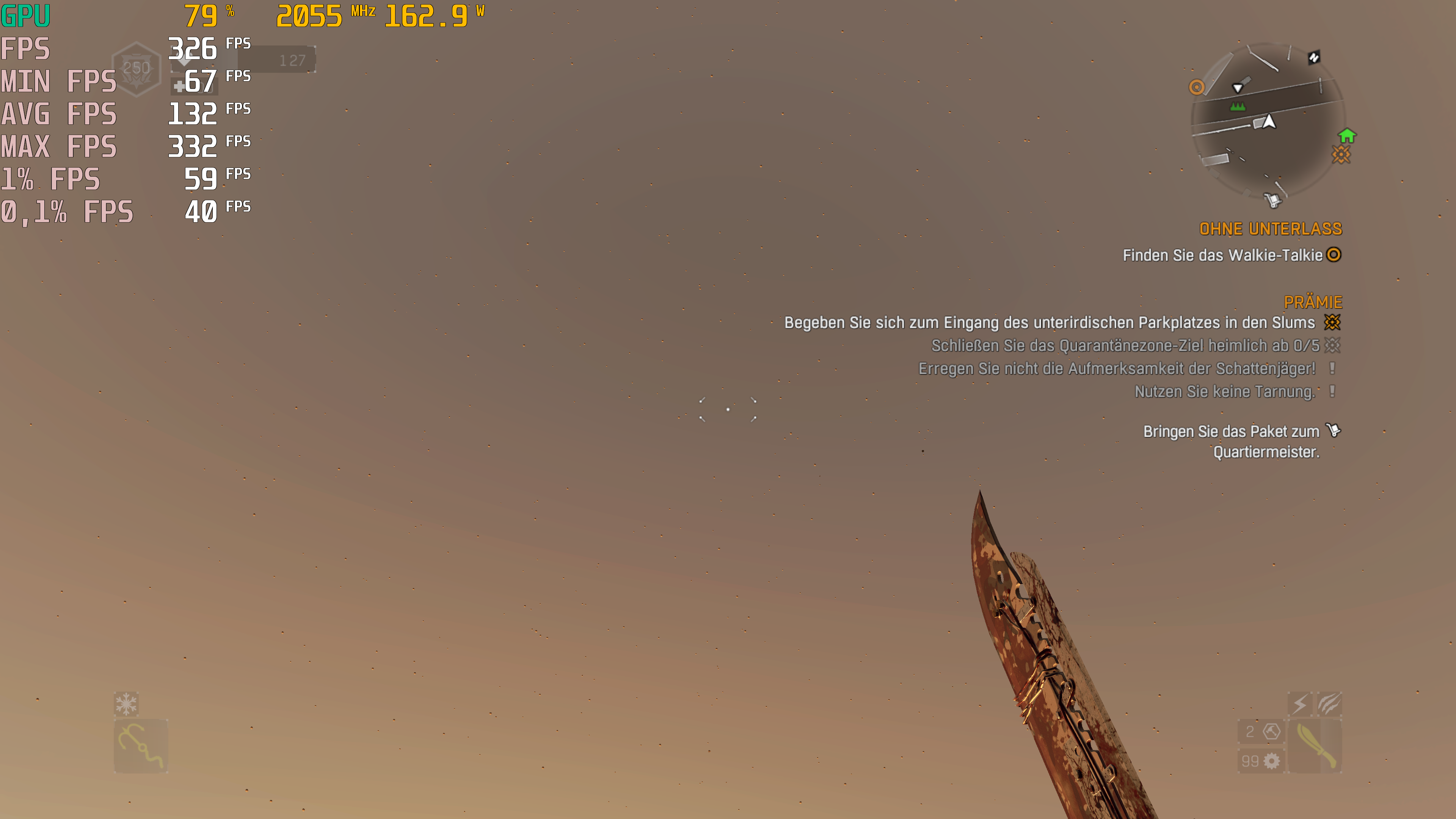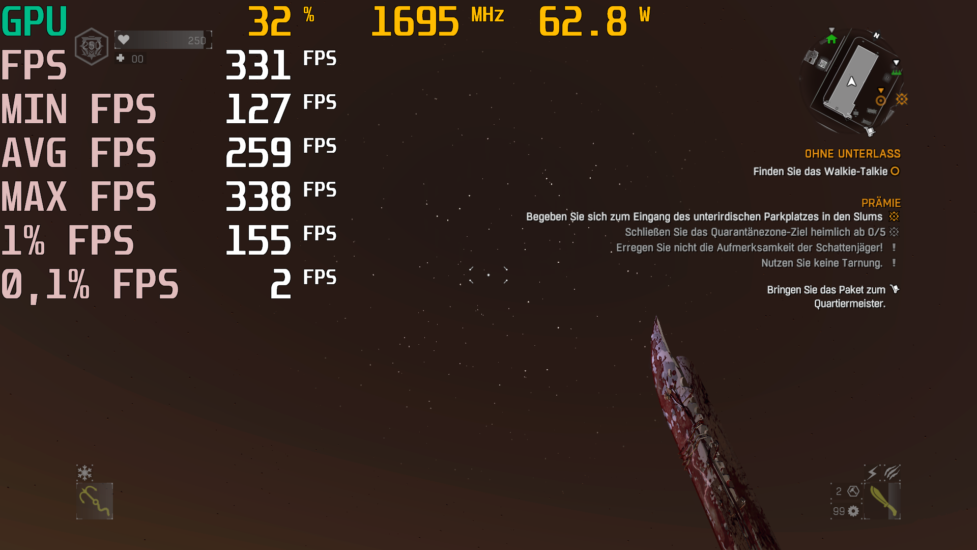 Eines der Situationen in dem Ich wirklich einen Unterschied von über 100FPS zähle zwischen 4K und FHD ist, wenn Ich im Spiel in den Himmel oder auf den Boden gucke. Auch wirken die Zwischen Sequenzen in 4k Flüssiger als in FHD.