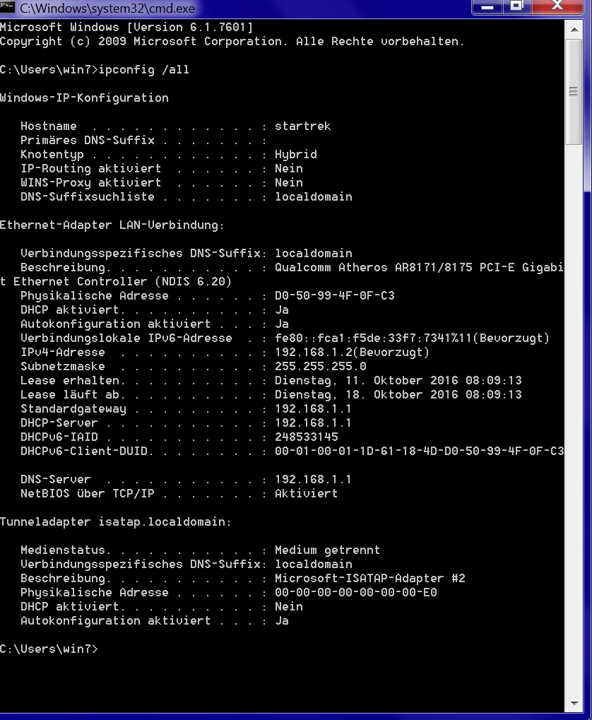 Was kommt raus wenn du in der Console "ipconfig" eingibtst? (die Console öffnest du mit [Windows-Taste] + [R] und dann "cmd" eingben)