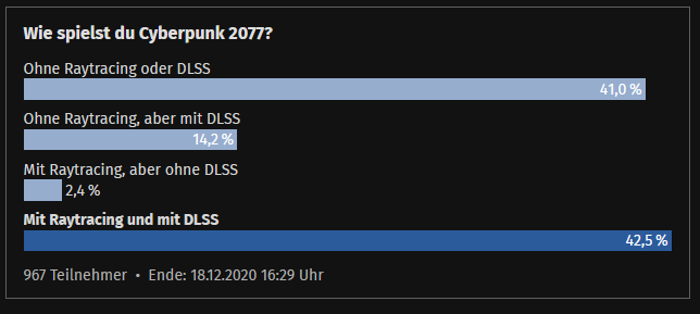 alle die für "mit raytracing", "mit DLSS" oder "mit DLSS und raytracing" gestimmt haben, besitzen eine geforce RTX der letzten oder aktuellen generation.