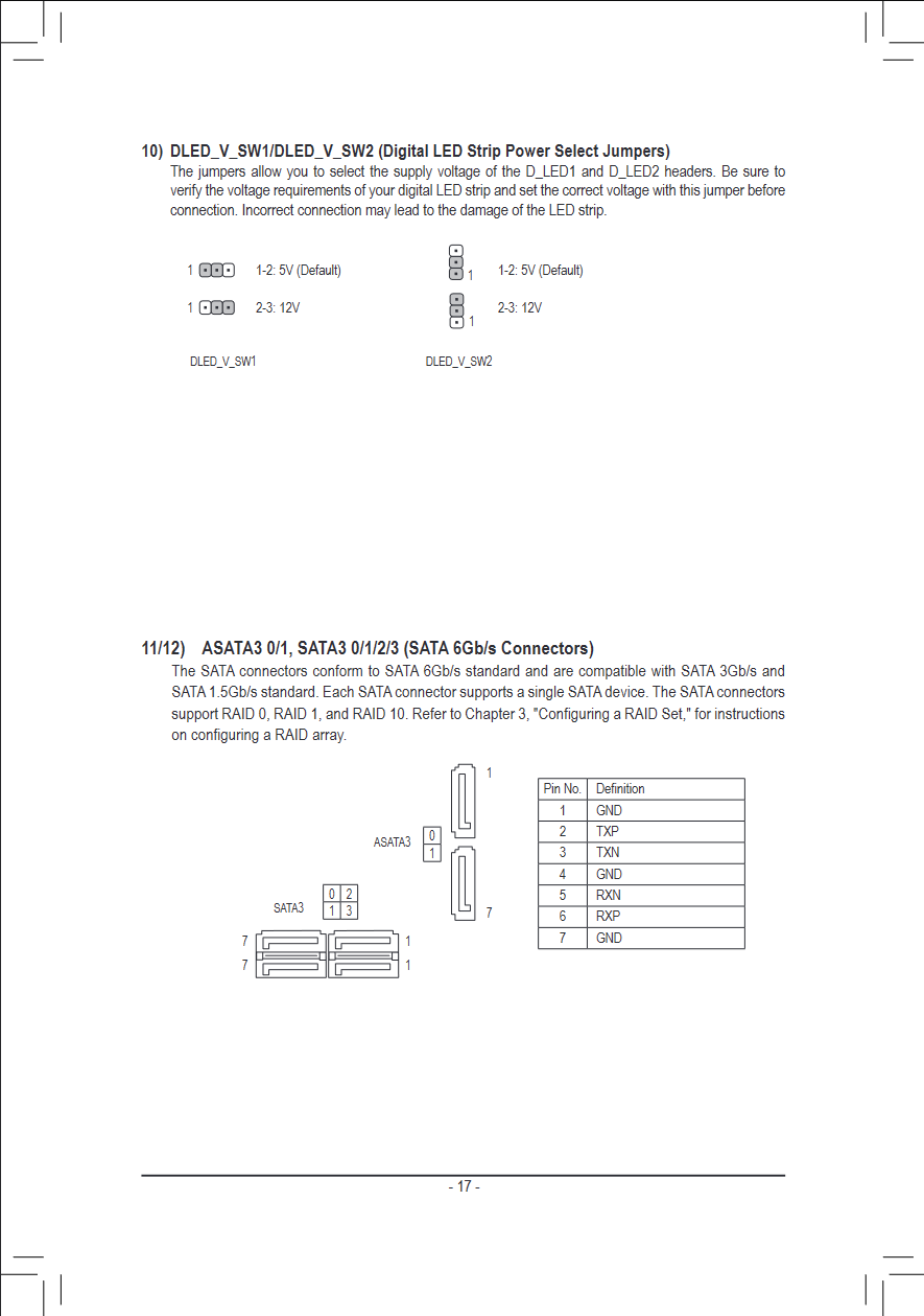 Connect your digital LED strip to the header. There are 12V and 5V digital LED strips. Be sure to verify the voltage requirements of your digital LED strips and set the DLED_V_SW1 and DLED_V_SW2 jumpers accordingly. The power pin (marked with a triangle on the plug) of the LED strip must be connected to Pin 1 of the digital LED strip header. Incorrect connection may lead to the damage of the LED strip