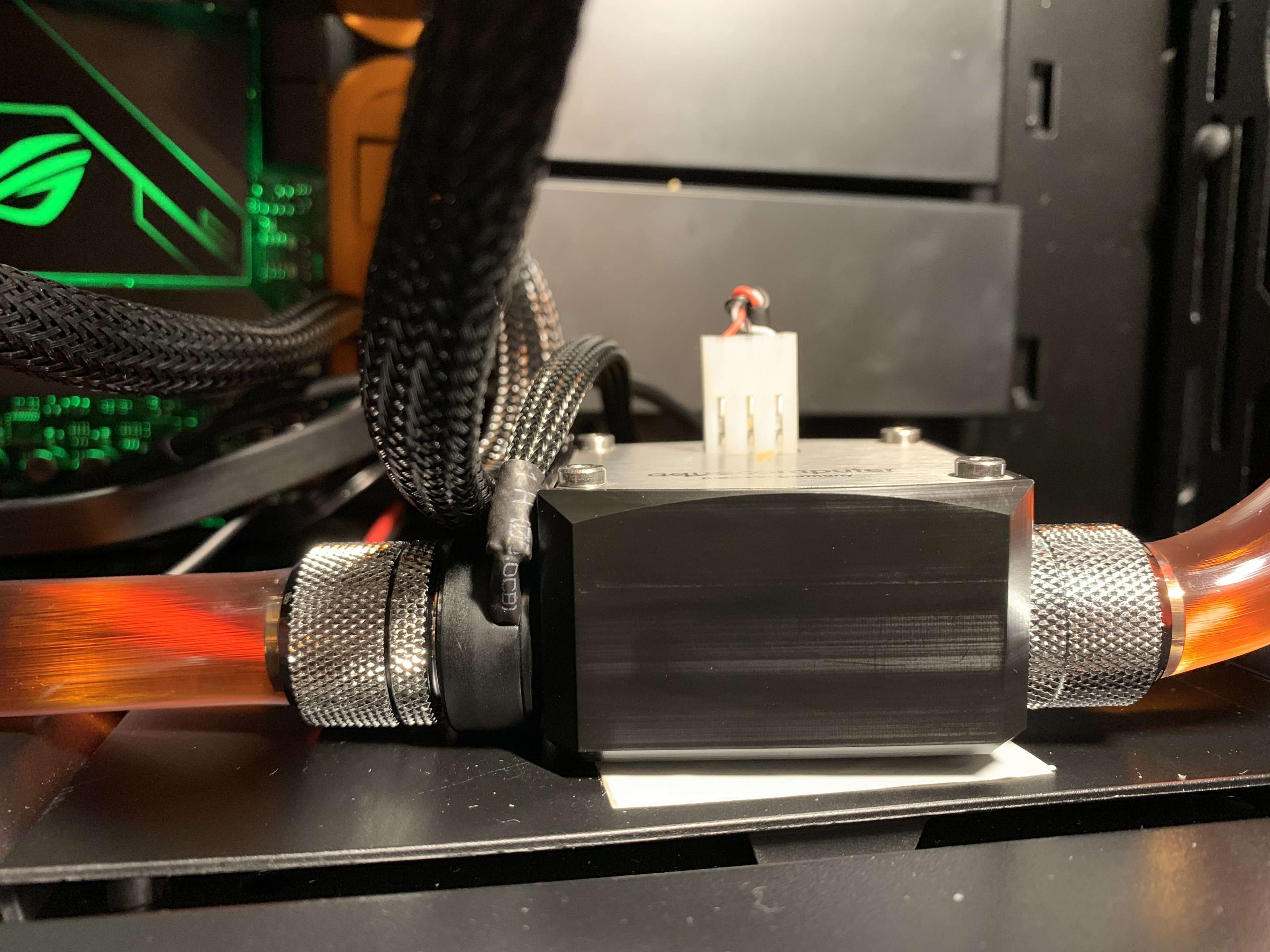 Den Durchflusssensor 90° drehen, dass die Eingänge nicht Richtung Front und Back zeigen sondern Richtung Mainboard und Seitenfenster.