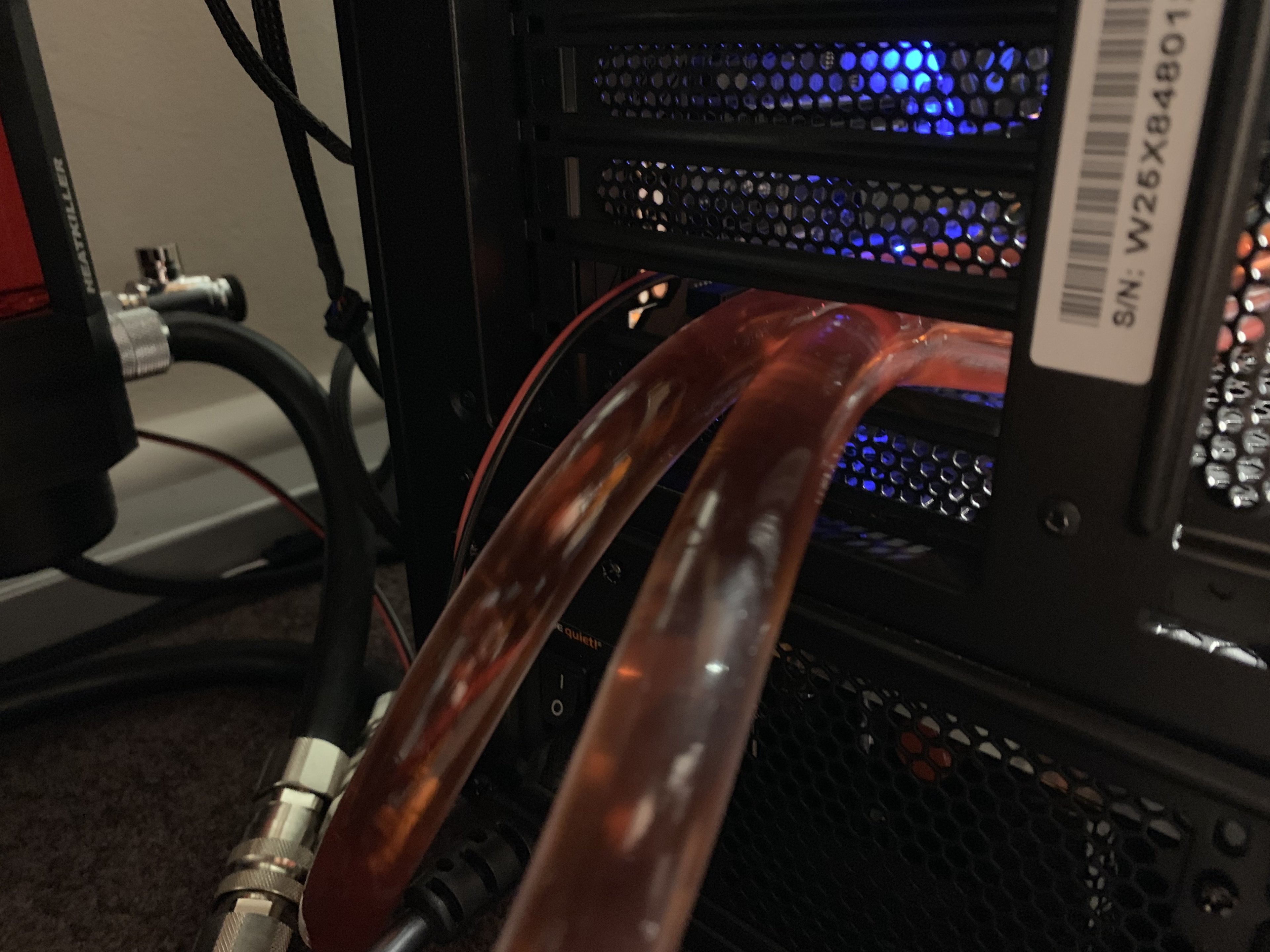 Auf jeden Fall in den Durchflusssensor 2 rechte Winkel rein. Einer vom Durchflusssensor nach oben richtung Graka