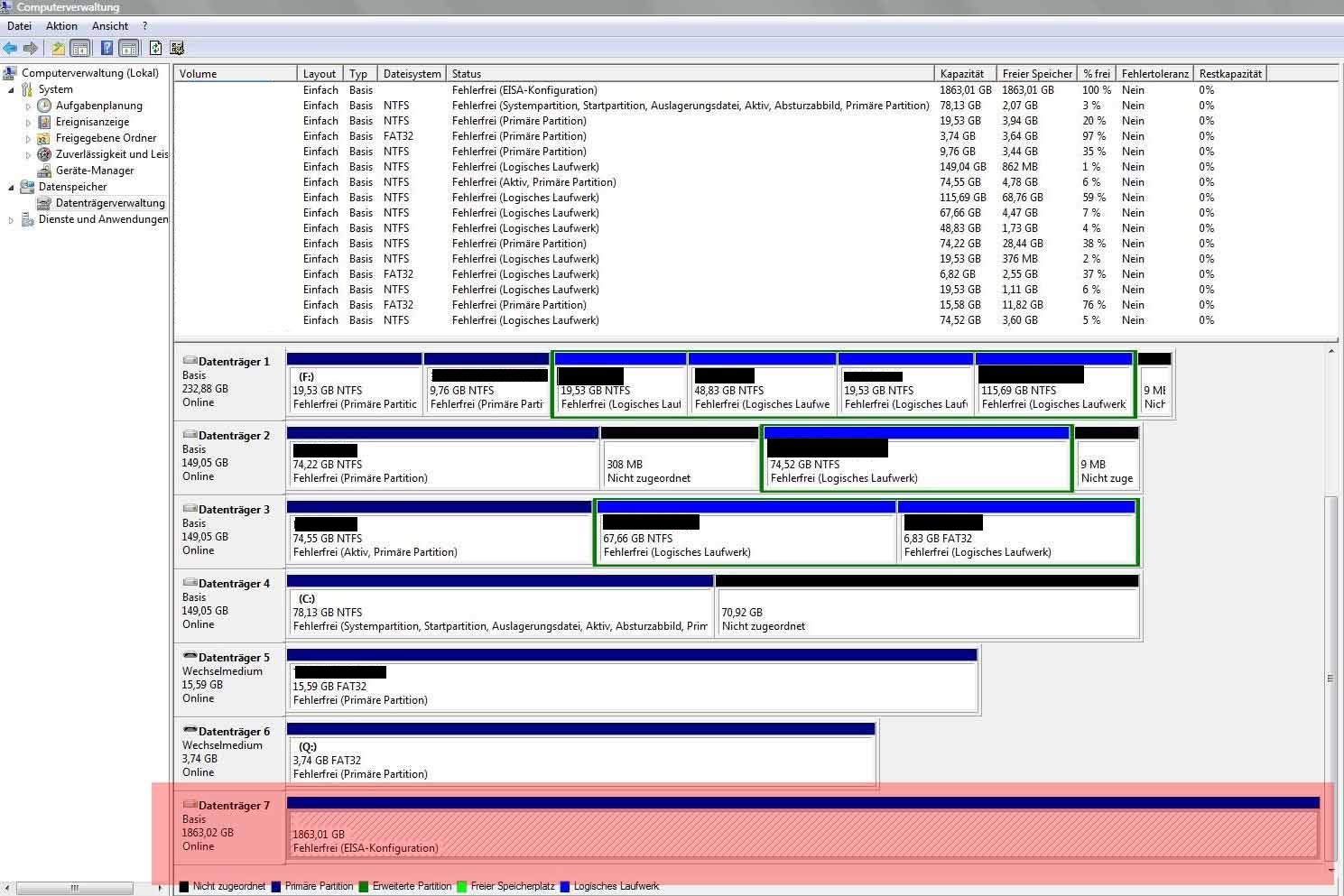 Ansonsten die Partition einfach löschen(rechtsklick in dem Feld, wo das EISA steht), eine neue anlegen und formatieren - dann ist allerdings alles weg, was bisher drauf war.