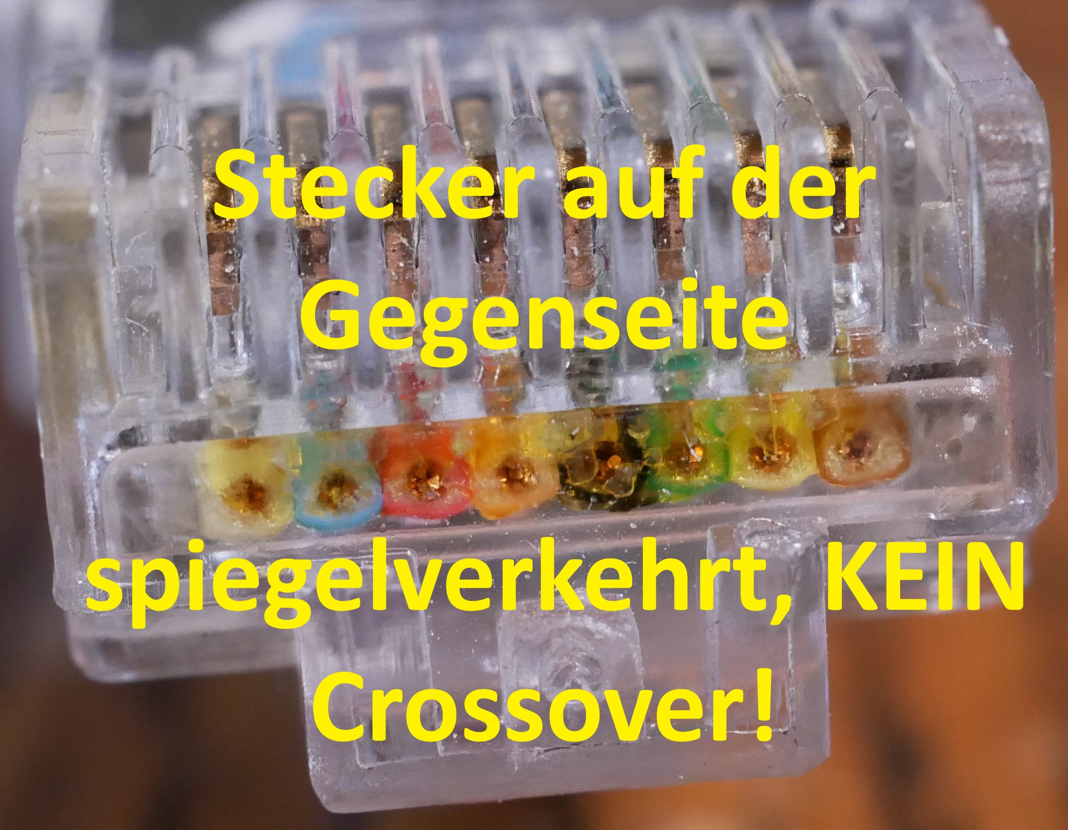 Ich bin gespannt, ob jemand hier ein solches Kabel kennt. Ich will keineswegs behaupten, alles in der Netzwerktechnik gesehen zu haben (ganz gewiss sogar nicht), aber ein komplett 1:1 verdrehtes Patchkabel habe ich so noch nicht in den Händen gehabt