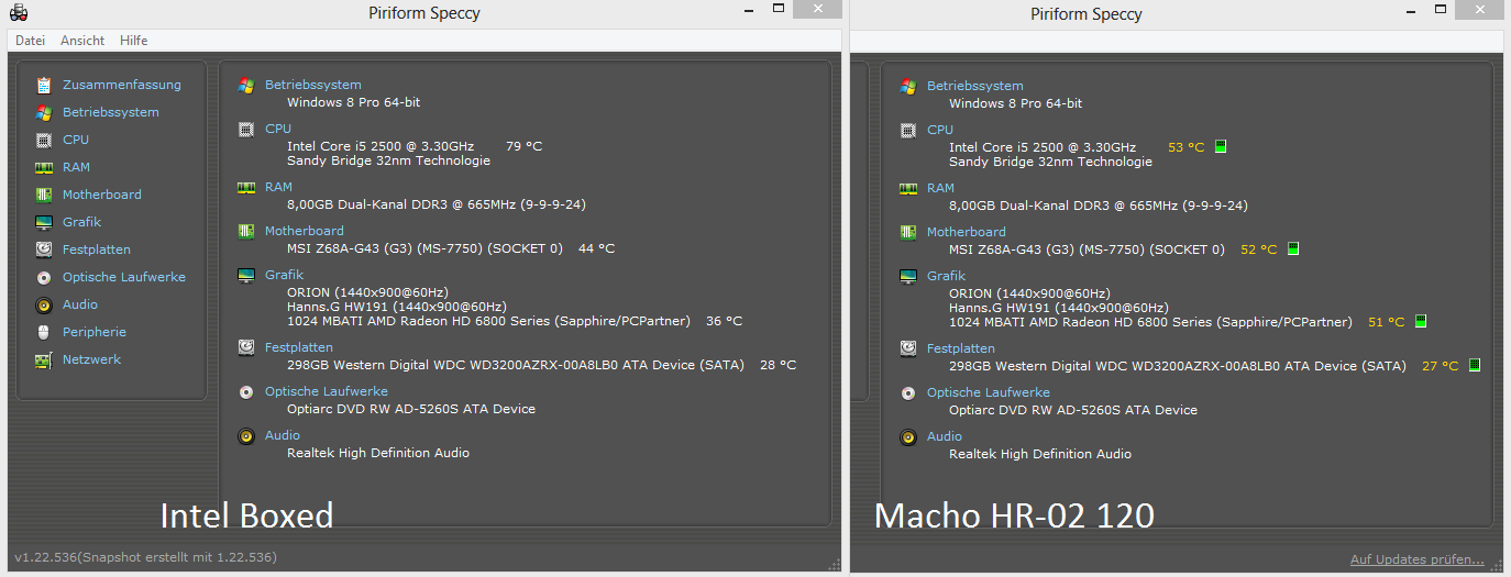 Einen Intel i5 2500, der bei Last auf 68°C hochgeht, kollege meinte bei 72°C ist wohl laut Intel erstma Ende bzw. Kritisch. Momemtan Boxed Kühler drauf.