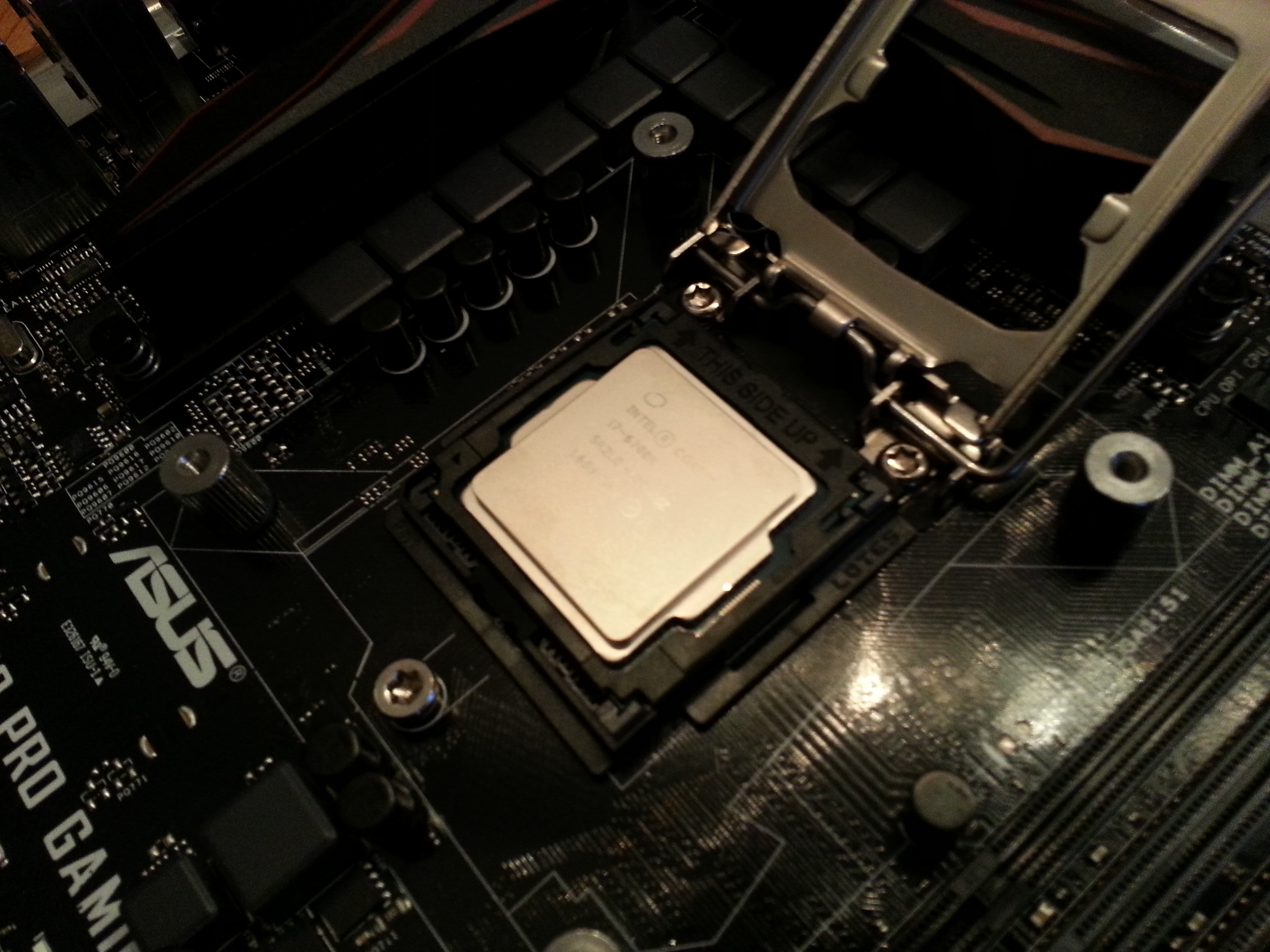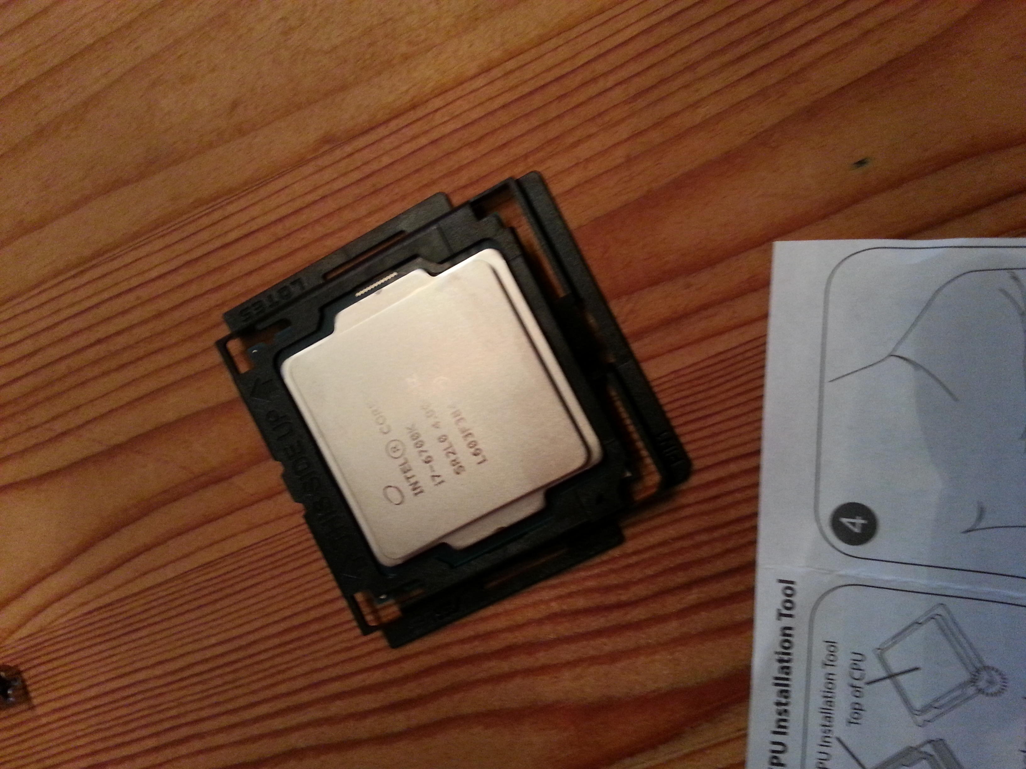 Ich setze gerade den CPU ein das dreieck muss laut Board unten links sein, das ist es. Die klammer an der Seite geht iwie extrem schwer nach unten, bevor ich was falsch mache frage ich hier lieber.