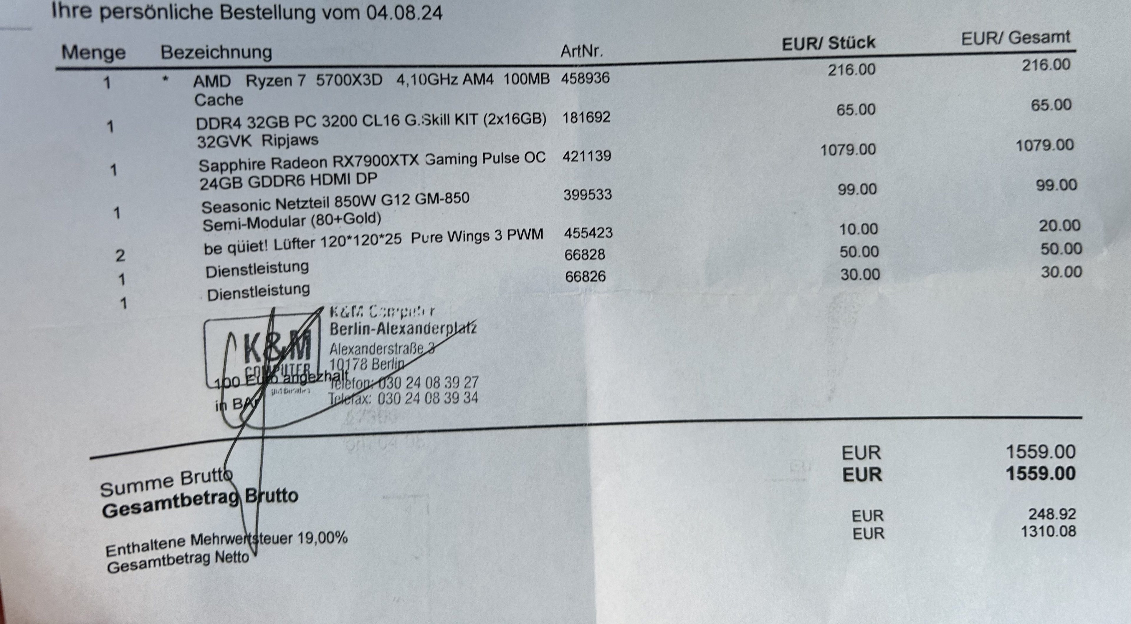 ahjo, du weiĂt was am Verkauf von Hardware beim HĂ€ndler bleibt ? Miete und GehĂ€lter mĂŒssen halt au irgendwie un wo bezahlt werden, die Preise bei K&M sind nicht umsonst so gesalzen, damit @Christian1976B um die Ecke gehen und diesen Service in Anspruch nehmen kannBlood011 schrieb:Hardwareversand hatte das damals fĂŒr 25 gemacht![]()
