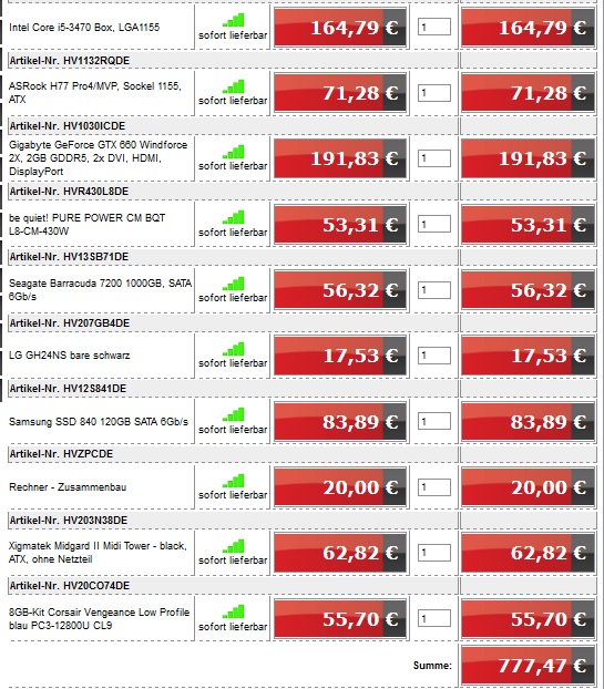 Preise sind etwas hoch, würde mal die Produkte über Geizhals heraussuchen und dann über die Produktseite von Geizhals bei Hardwareversand reingehen da kannst du ein paar Prozente sparen.