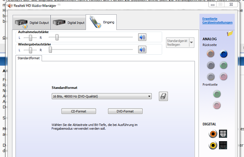 Wenn kein Ton kommt, dann sollstest du bitte die Lin-In Pegel in deiner Software und Realtek Mixer mal anheben.