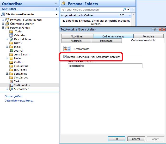 habe ein kleines Problem. Nutze auf der Arbeit Outlook 2003 über Exchange. Dadurch habe ich natürlich standardmäßig die Globale Adressliste zur Verfügung. Nun habe ich meine privaten Kontakte als PST-Datei importiert. Er zeigt mir nun im Reiter Kontakte zwei Einträge an: einmal "Contacts", welche leer sind und einmal "Kontakte", die meine Einträge enthalten.