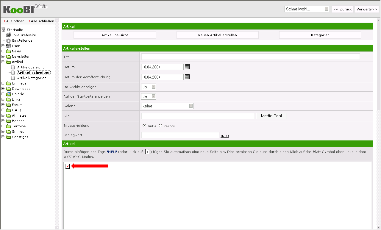 Ich muss grad im Koobi Admin arbeiten, allerdings hab ich ein "kleines" Problem und zwar wird der Bereich, in dem man normalerweise den Text eingibt, nicht angezeigt. Ich habe auch schon Java (neu) installiert, die Sicherheitseinstellungen runtergedreht, den Internet Explorer sowie MyIE2 probiert, aber dass alles bringt rein garnichts. Ich wäre euch sehr dankbar, wenn ihr mir helft, es ist ziemlich wichtig.