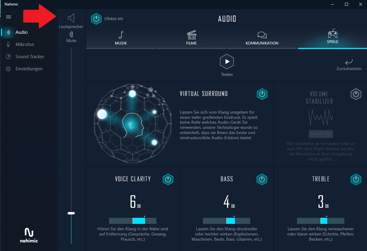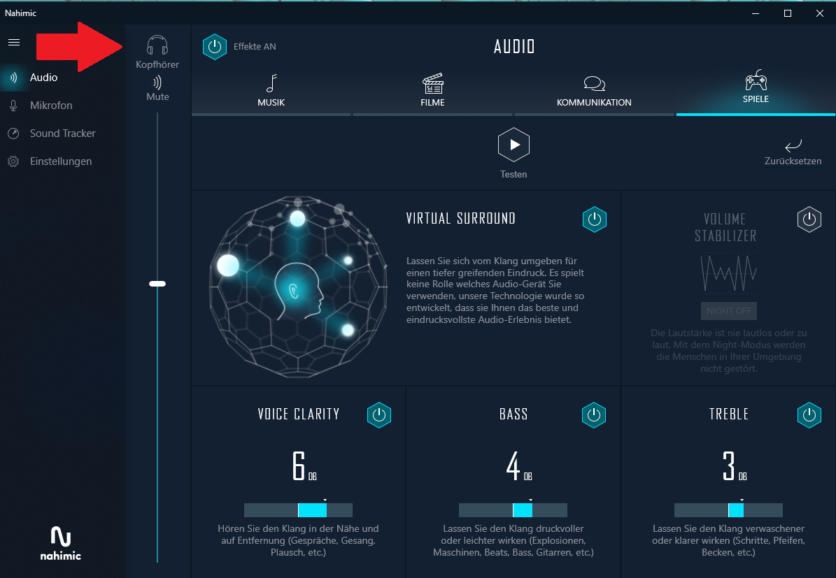 Sobald man einen Kopfhörer einsteckt, wechselt im Audio Fenster von Lautsprecher auf Kopfhörer.