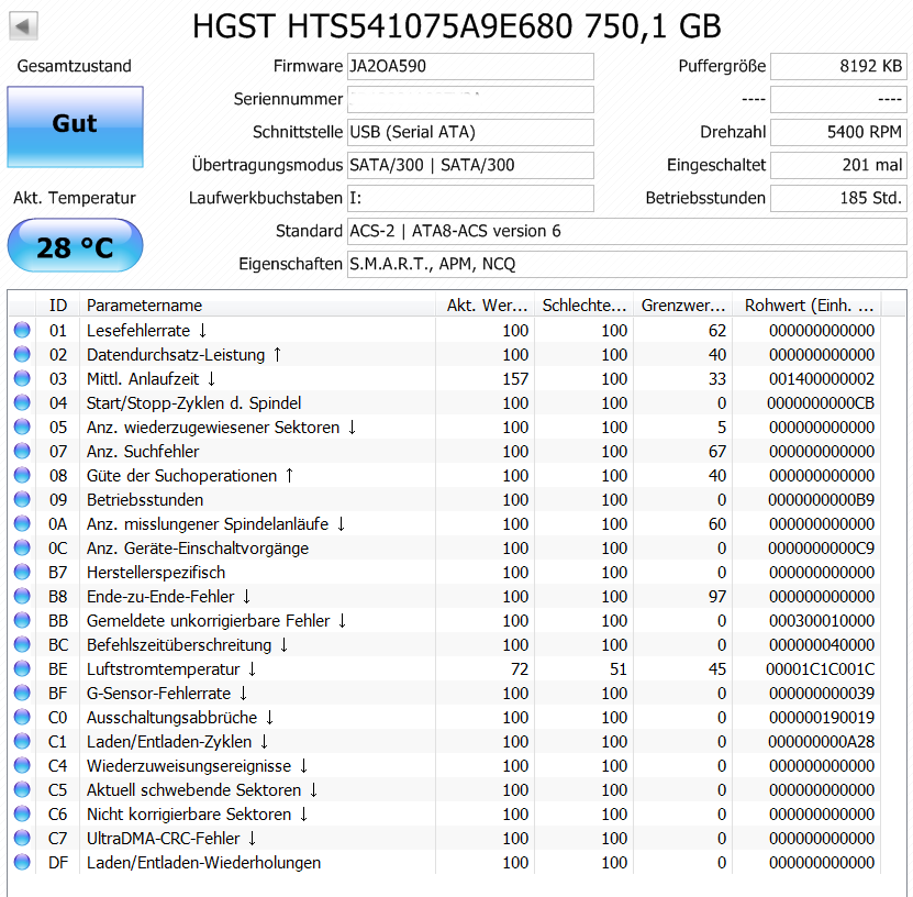 Ich habe jetzt bei einer zweiten externen 2,5''-Festplatte festgestellt, dass das Kopieren von großen Dateien (GB-Bereich) auf diese Festplatten unglaublich langsam abläuft Die Übertragungsrate liegt bei ca. 1MB/s. Anschluss über USB 2.0, das ganze unter Windows 7. Bei einer externen 3,5''-Festplatte, die ich auch ab und zu anschließe, funktioniert das Kopieren in "normaler" Geschwindigkeit (20-30 MB/s).