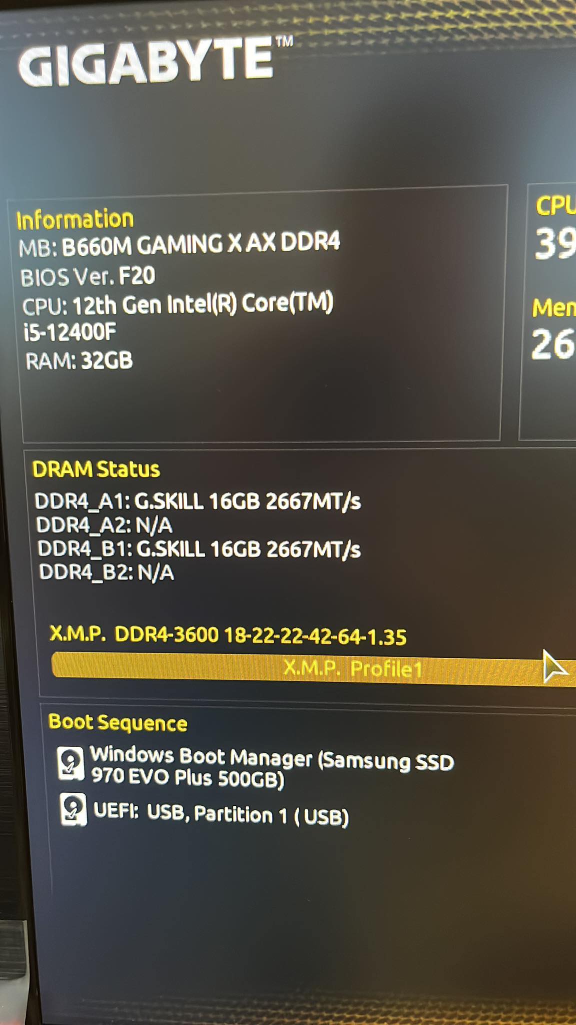 ich habe ein Gigabyte B660M X DDR4, Intel i5 12400F und G.Skill RIpJaws V 32GB DDR4 3600 CL18 verbaut.