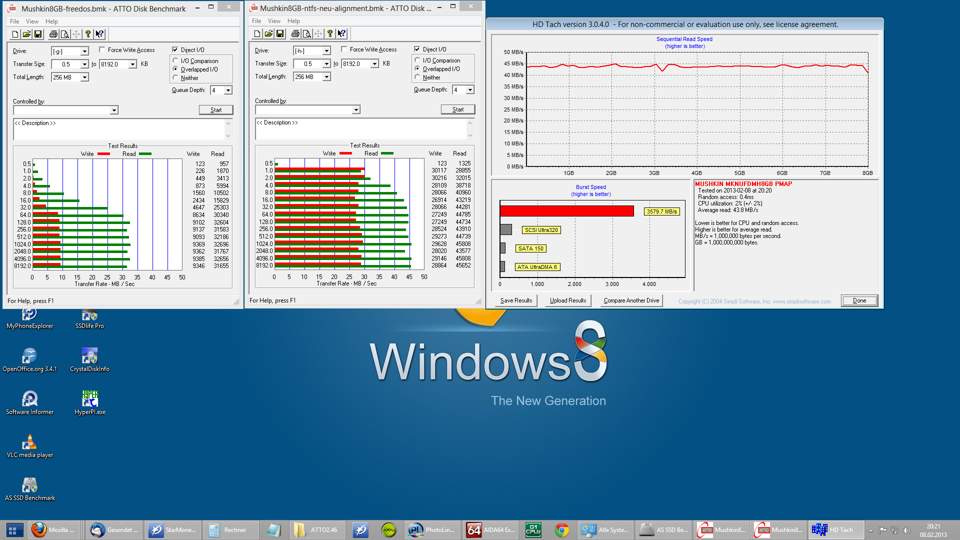 noch ein kleiner Ergänzungs-screen, der write ist Hammer, ich hab auch files vom stick kopiert auf die SSD und umgekehrt und überall kommen diese Werte genau hin, sieht man ja bei W8 in dem grünen Fensterchen genau!