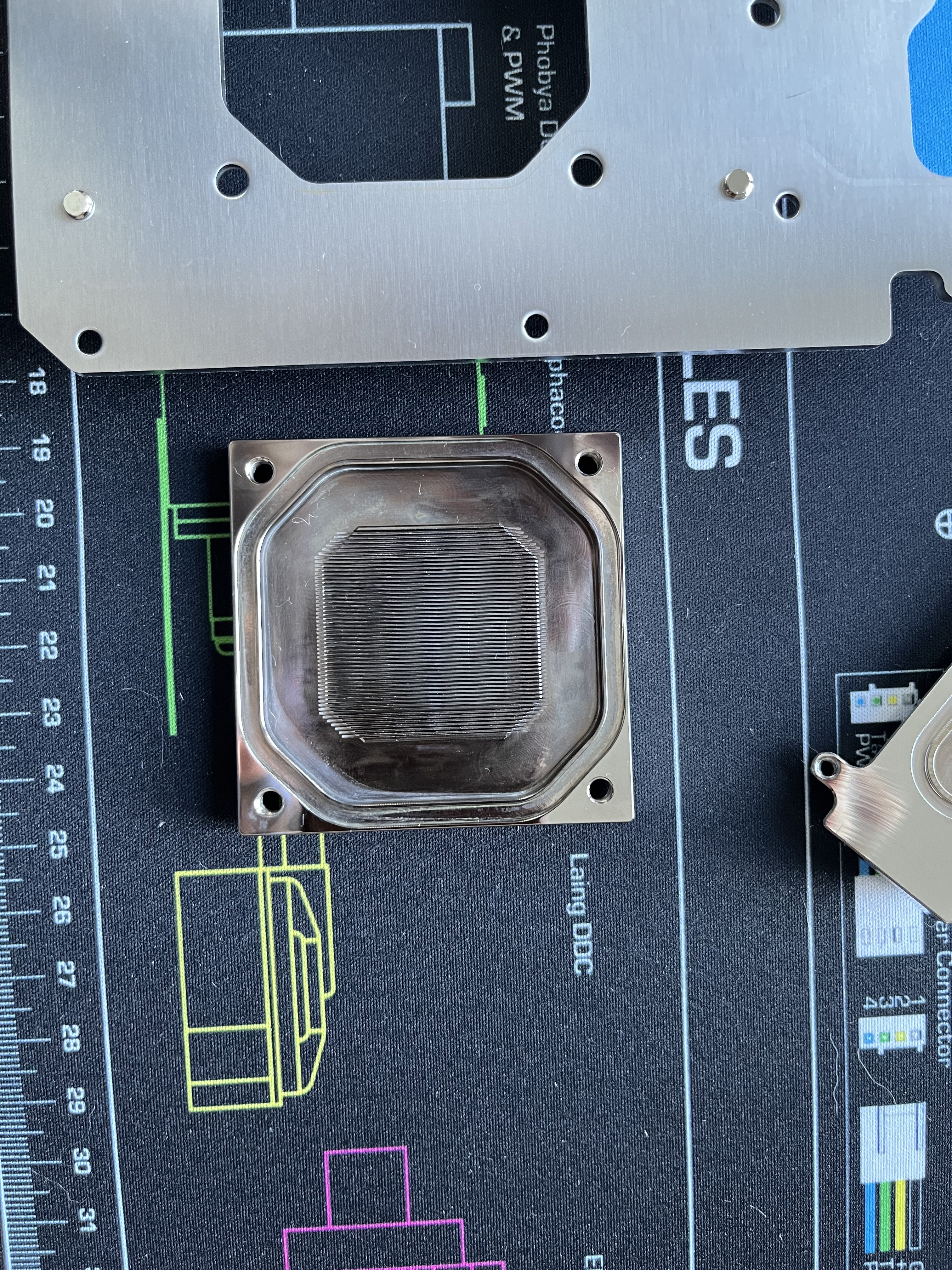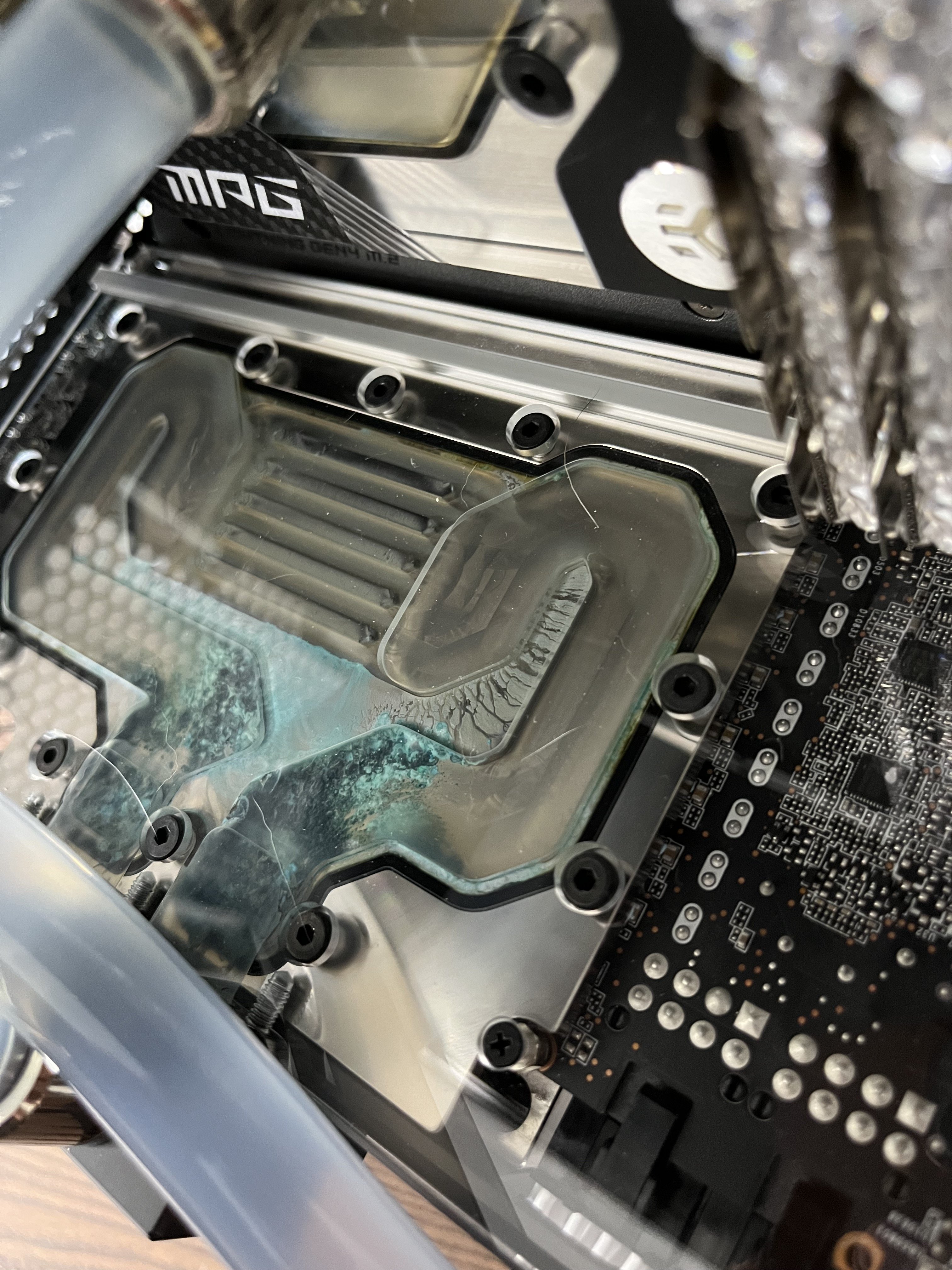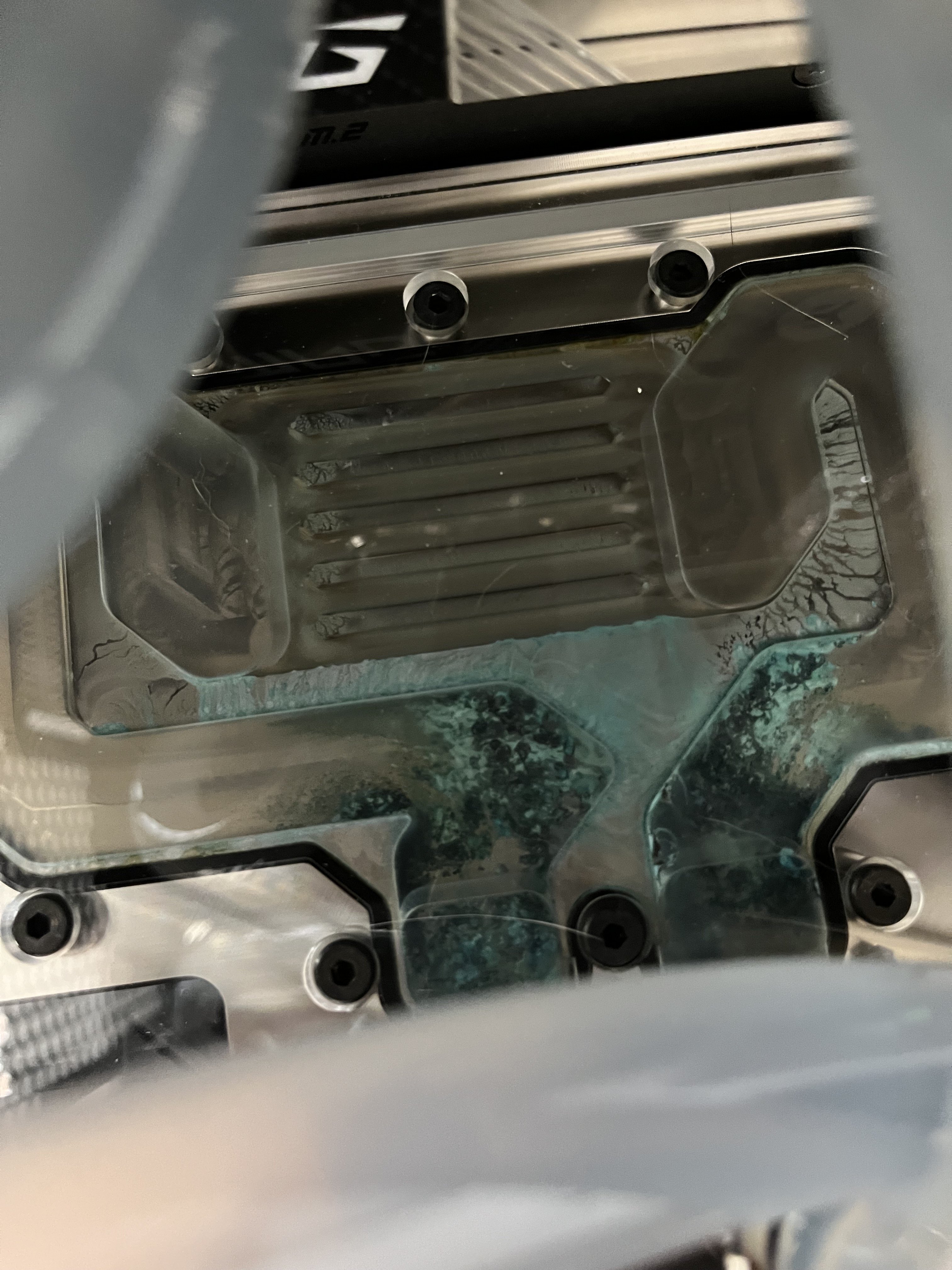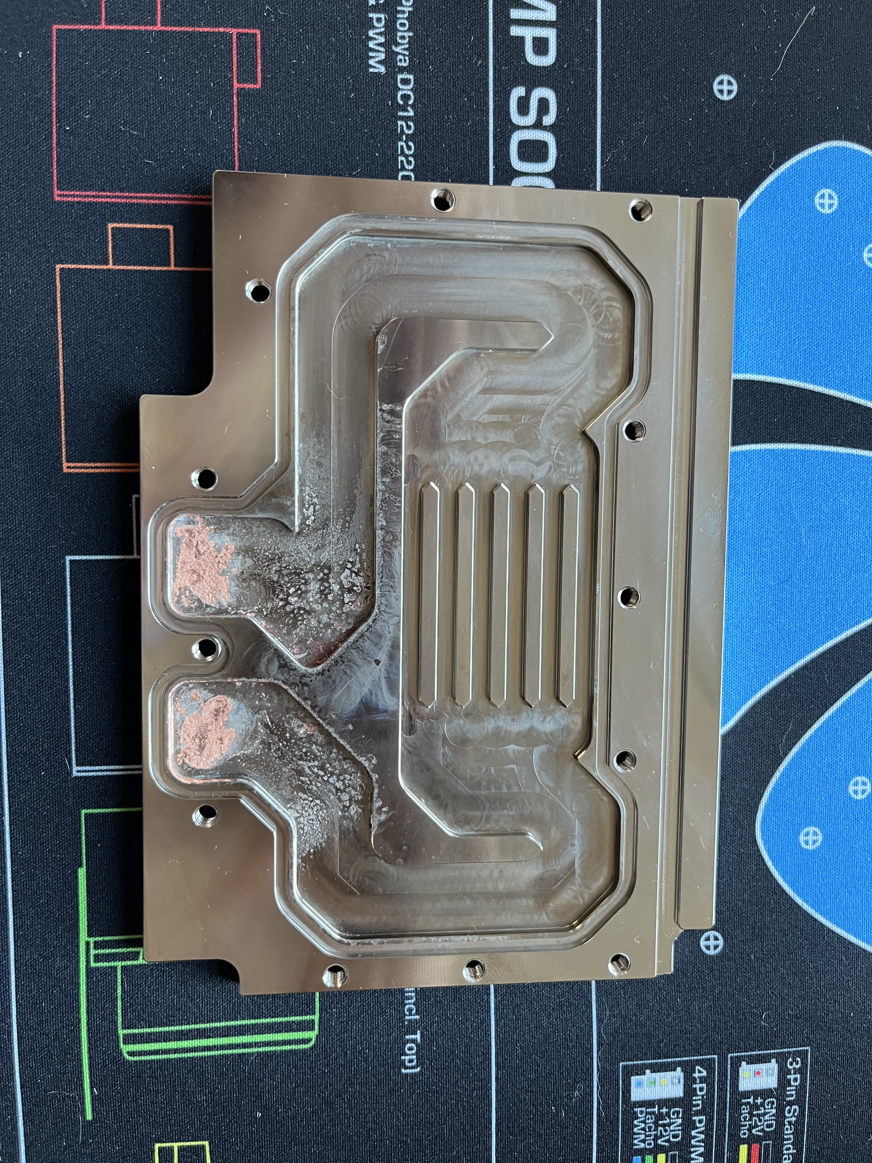 Und nach wenigen Tagen sehe ich folgendes auf der Active Backplate (siehe Bilder) der CPU Monoblock und der Grafikkartenblock scheinen, zumindest auf den ersten Leihenblick, noch nicht betroffen zu sein. Das vorher klare Wasser hat sich leicht bläulich verfärbt, was ich mit dem gelösten Nickel begründen würde.