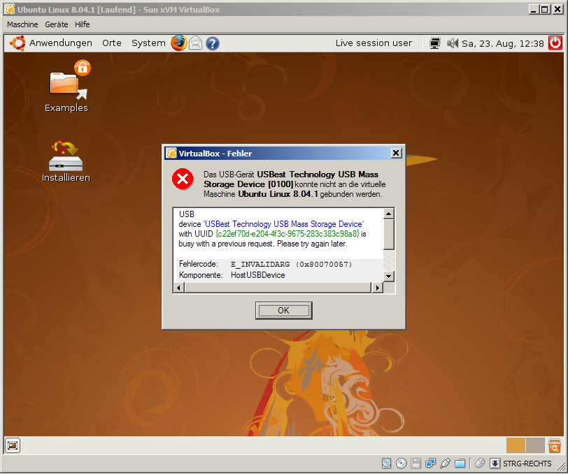 Sollte eine kryptische Fehlermeldung auftauchen, obwohl das VirtualBox USB-Gerät richtig installiert ist,