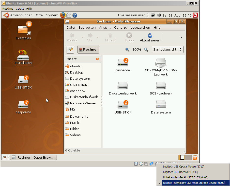 sollten sich alle USB-Geräte korrekt in die virtuelle Maschine einbinden können.