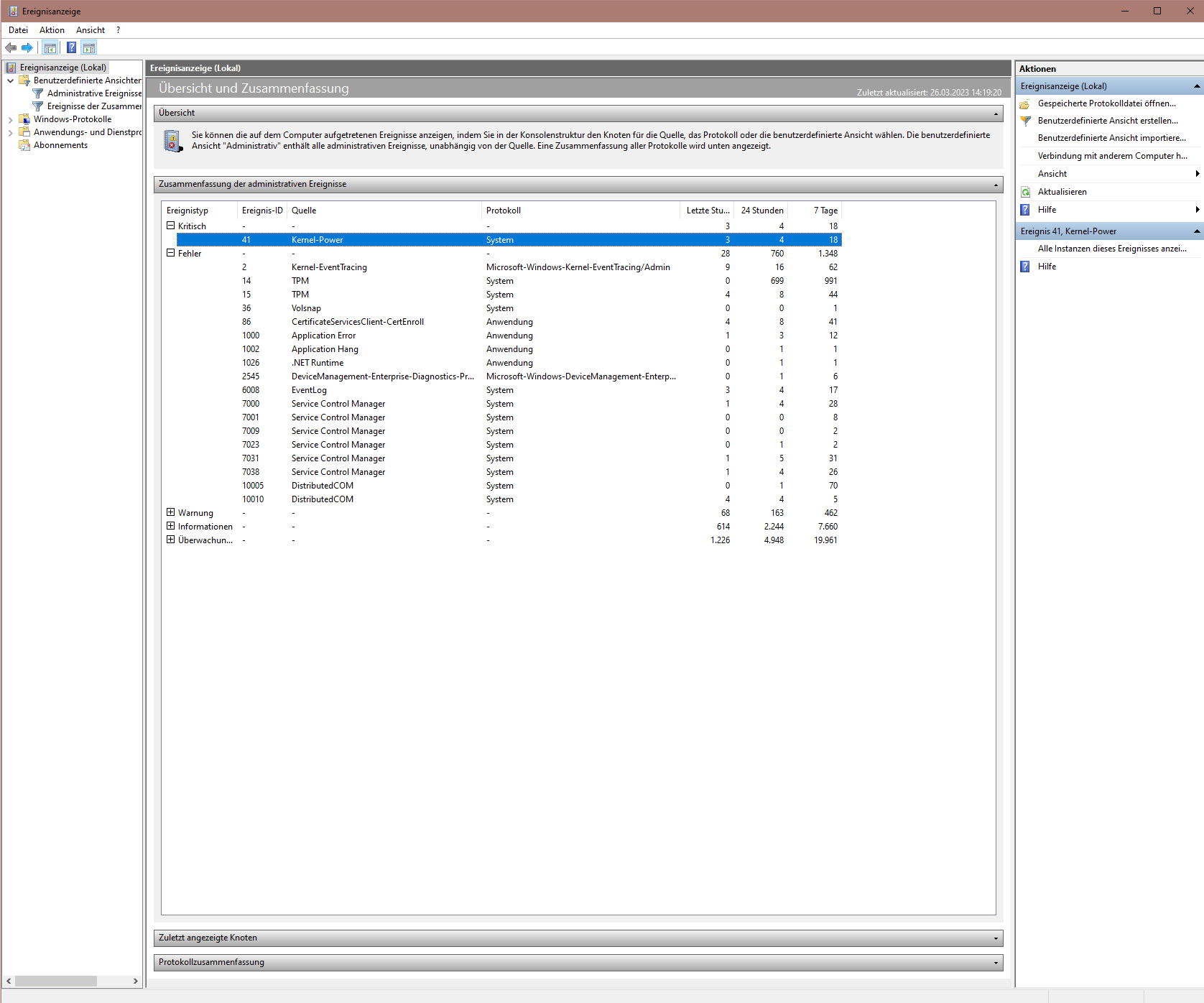 - im Event Viewer werden mehrere "Kernel Power 41" Fehler angezeigt (ist bei Bluescreen ja normal) aber neben auch einige Fehler die um einige ecken immer wieder auf ein nicht funktionierendes TPM Modul zeigen. (die TPM-Fehler zwar zahlreich (699 in 24h und 991 in 7d) aber in letzter stunde 0 obwohl ich in diesem Zeitraum Crashes hatte.) ich werde mal ein Bild hinzufügen