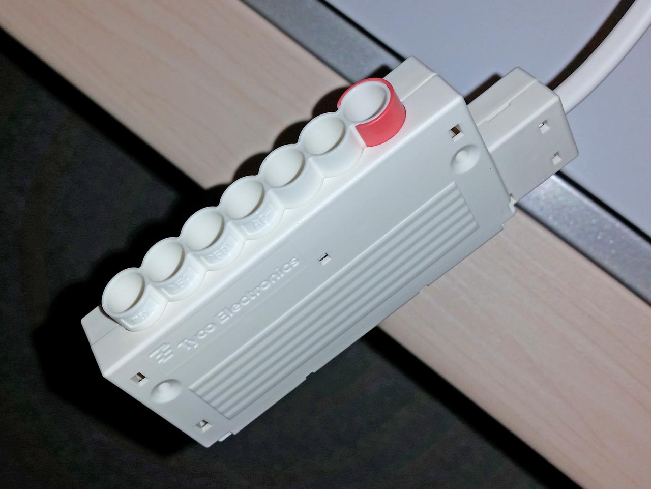 * an einer der kleinen weißen Buchsen wird der 230V Trafo eingesteckt