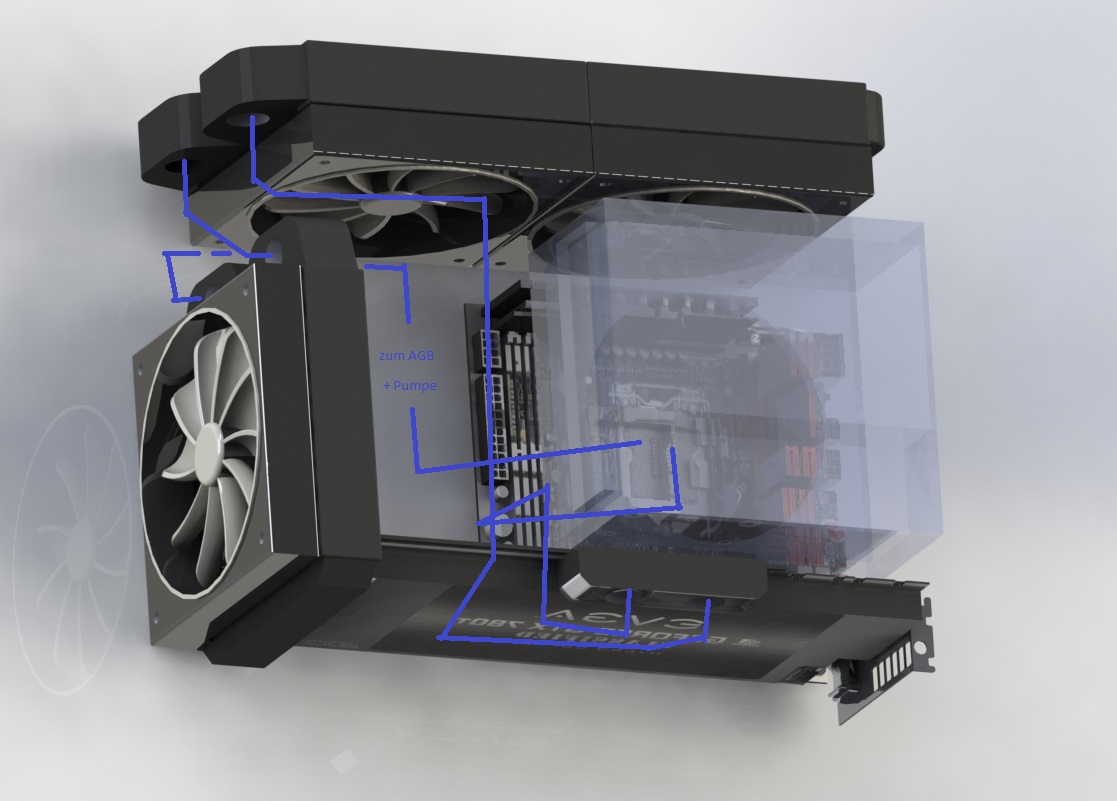Ich hab da auch mal was gemacht, wie ich das ungefair machen würde ( Leider find ich die genauen Maße von den Anschlüssen nicht, es gibt übrigens noch Kompakte Anschlüsse wie diese http://www.aquatuning.de/product_in...1-4-90--drehbar---kompakt---black-nickel.html )