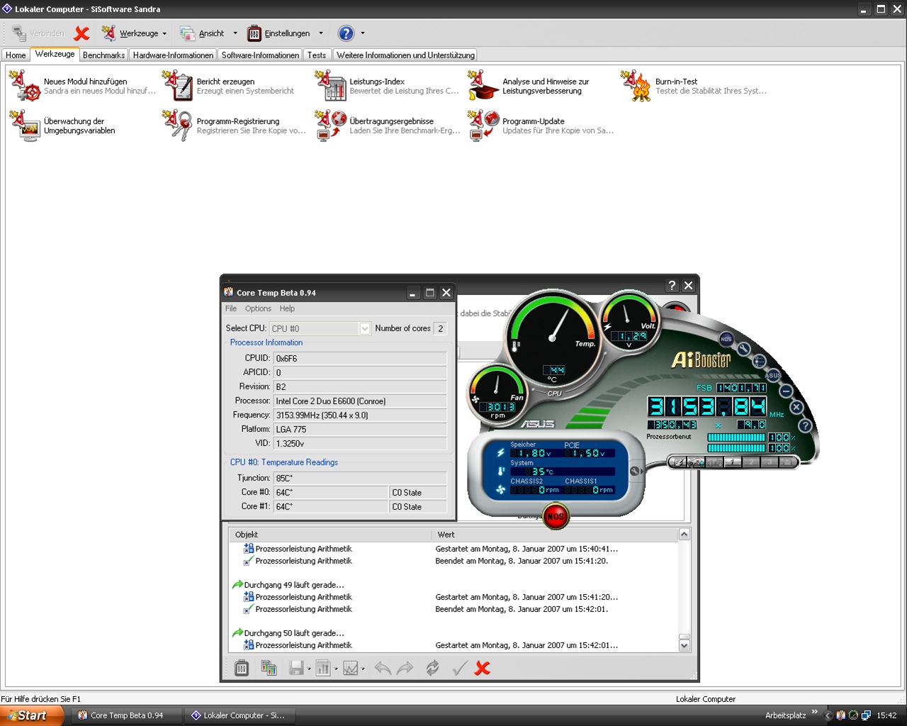Habe mich auf die Anzeige vom AIBooster verlassen, die jedoch wohl nicht die Coretemp zeigt.Das angehängte Bild zeigt nun den AIBooster, Coretemp und Sandra beim BurnIn Test.Hab mal 50 Durchläufe machen lassen und das Ergebnis ist zwar anders, aber trotzdem immer noch sehr passabel für einen Boxed Lüfter.