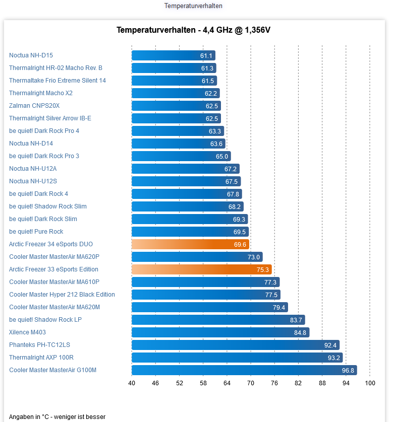 Die Temperaturen unterscheiden sich zu der Wasserkühlung um 3-4 Grad im Idle und 4-7 Grad unter Last.