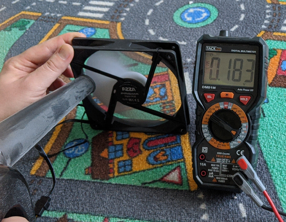 8,06 V und 2,52 mA bei Vollgas. Diesmal wurde ein 3Pin Lüfter für den Versuch genutzt.